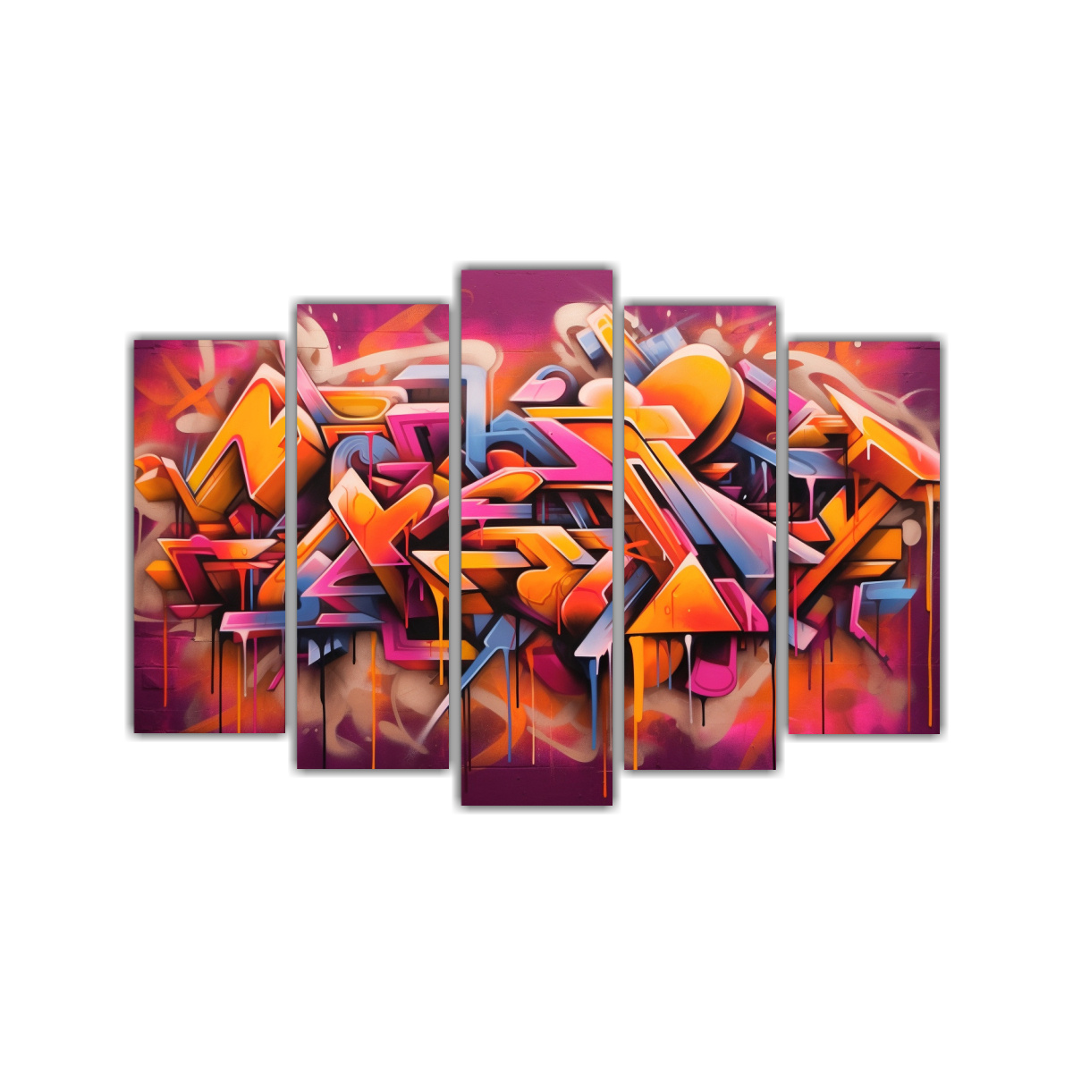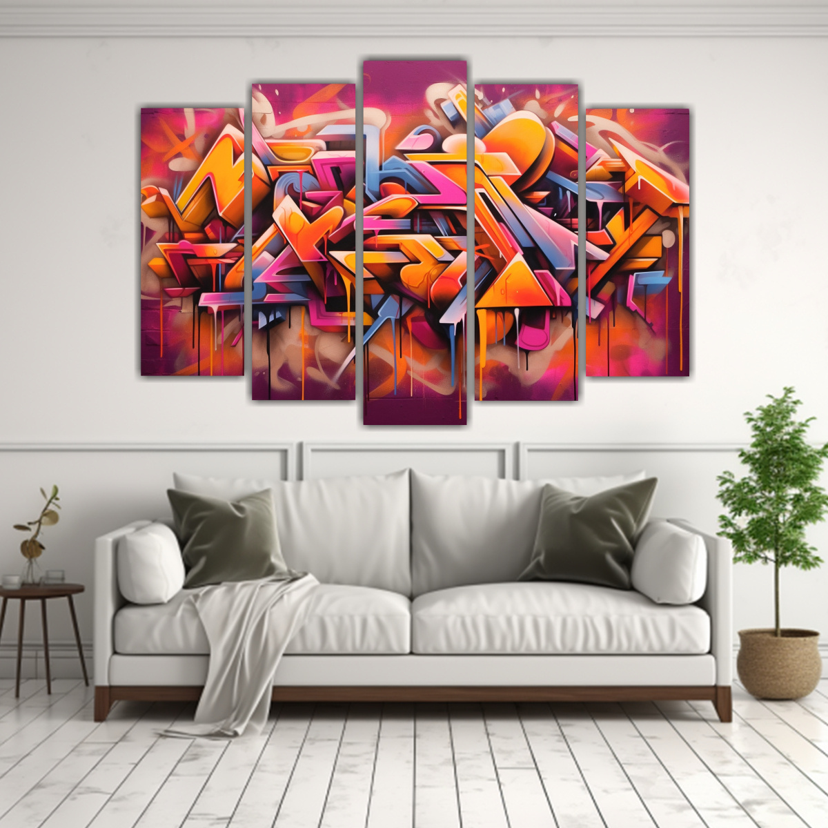 Este cuadro de graffiti dinámico en tonos morado, naranja, rojo y amarillo sería ideal para decorar una sala de estar moderna o un estudio creativo Combínalo con muebles neutros para que resalte y añada un toque urbano y colorido a tu espacio