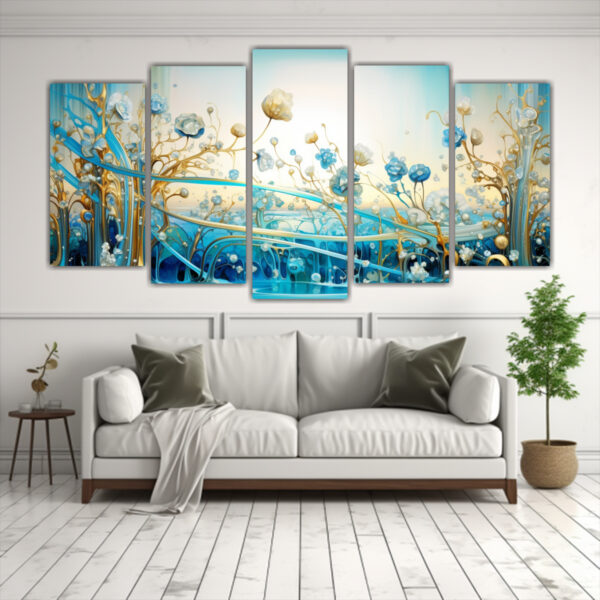 El Cuadro Decorativo Horizontal en Colores Vibrantes y Dorados de DecoCuadros es perfecto para darle vida a cualquier ambiente Con su combinación de tonos verde azulado, beige, turquesa, gris, chocolate, plateado y azul marino grisáceo, este cuadro añade frescura y sofisticación a tus espacios Nuestros cuadros están impresos en tela de alta calidad con bastidores de madera, garantizando durabilidad y resistencia