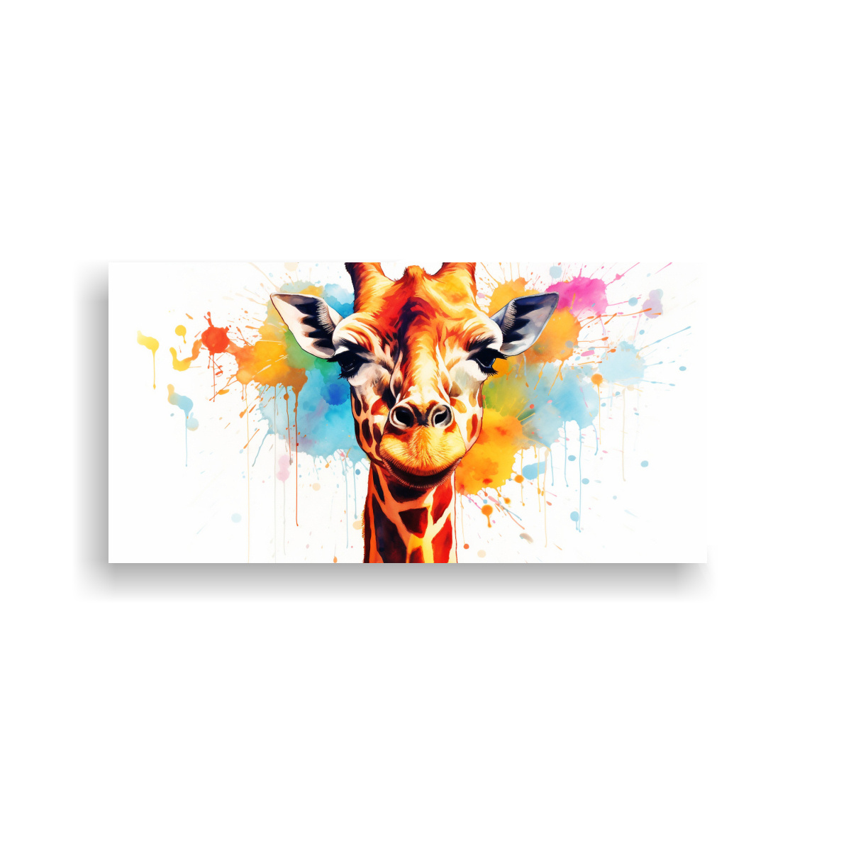 Coloca esta pintura de jirafa en acuarelas coloridas en la sala de estar para darle un toque de arte callejero moderno Combina los tonos carmesí, dorado y verde azulado con cojines y accesorios decorativos a juego para lograr un ambiente vibrante y acogedor ¡Sorprende a tus visitas con esta pieza única!