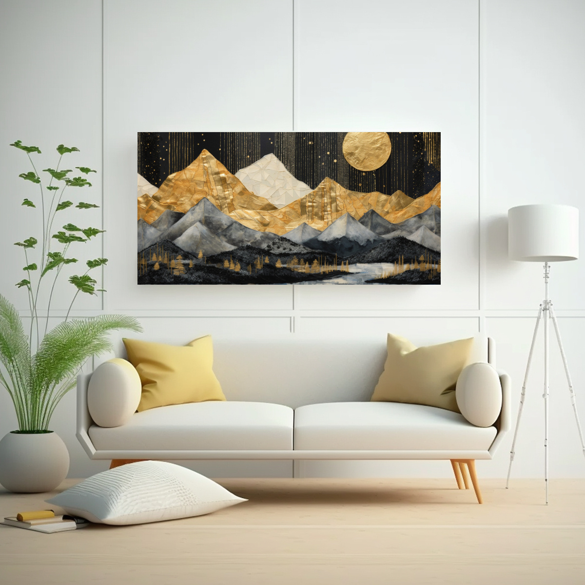 Este cuadro de Pintura Inspiradora Enigmática con Luna y Montañas es perfecto para decorar tu sala de estar o habitación Combínalo con muebles en tonos neutros como blanco, beige o gris para resaltar los colores vibrantes de la pintura Colócalo sobre un sofá o encima de una cama para crear un punto focal en la habitación Su diseño enigmático y misterioso seguramente captará la atención de tus invitados
