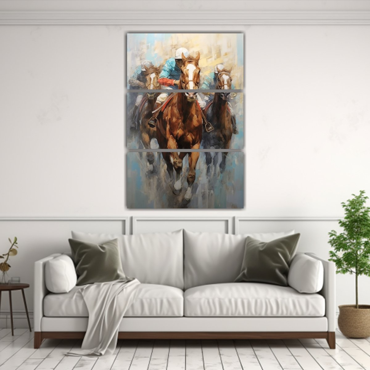 Este cuadro de pintura intensa de caballos de carreras en lienzos es ideal para decorar tu sala de estar o estudio Combínalo con muebles modernos en tonos neutros como blanco, negro o gris, para crear un ambiente elegante y sofisticado Colócalo en una pared prominente para que se convierta en el punto focal de la habitación ¡Impresiona a tus invitados con esta pieza única de arte inusual!