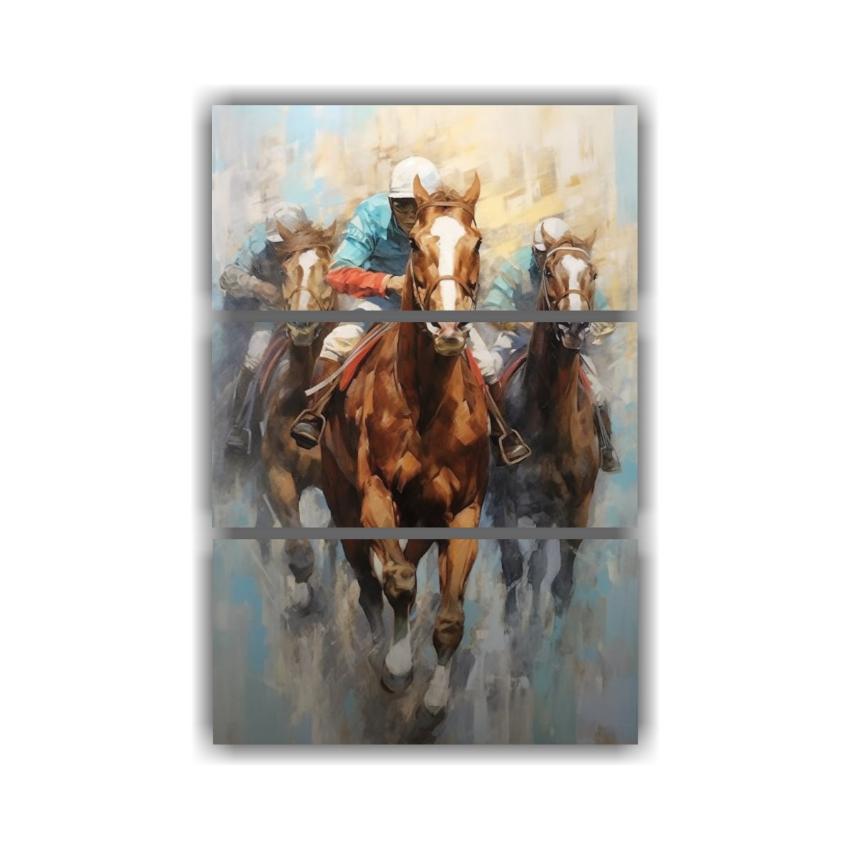 DecoCuadros ofrece cuadros decorativos impresos en tela de alta calidad con bastidores de madera Nuestro set de 3 lienzos de la pintura intensa de caballos de carreras en tonos plateado, gris, azul marino grisáceo y chocolate, es perfecto para añadir un toque único y llamativo a tu espacio Con diseños exclusivos de nuestra tienda, garantizamos la mejor calidad del mercado a precios económicos Además, ofrecemos envío gratis y entregas rápidas en Santiago, y envíos express a regiones