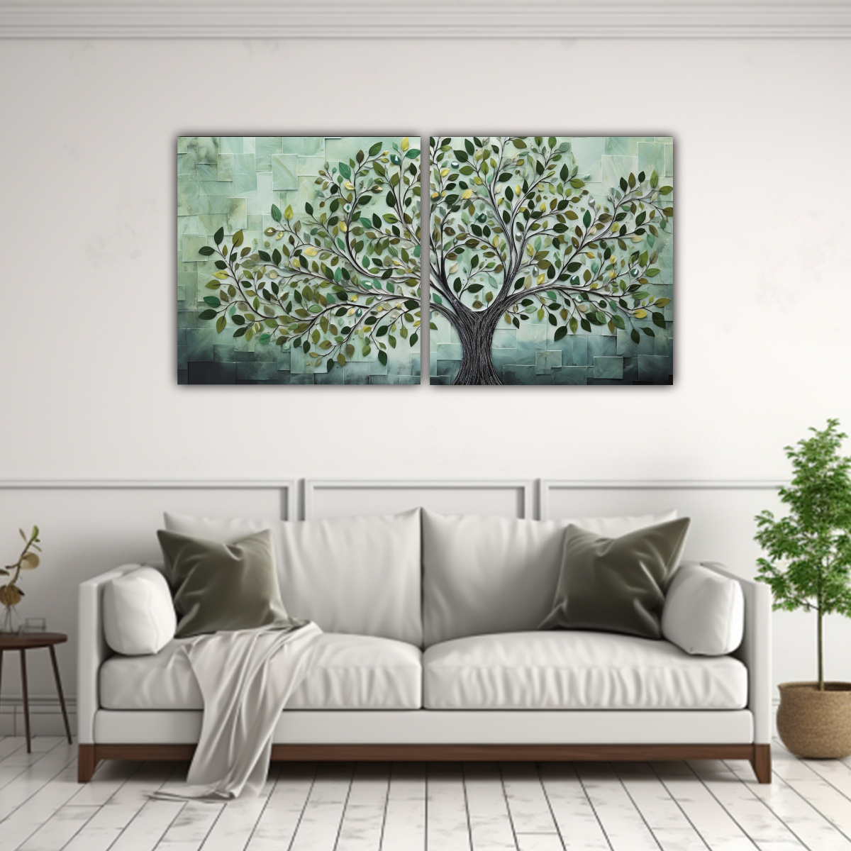 Pintura Juvenil Expresión árbol Verde Y Plateado En El Decorativo Diptico