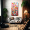 Recomendamos colocar este cuadro en un salón amplio o en una sala de estar con muebles de tonos neutros como beige o blanco Así, se creará un contraste armonioso y resaltará la belleza de la pintura abstracta de carnaval Además, se puede complementar con cojines en tonos similares a los colores del cuadro para lograr una decoración coordinada y elegante