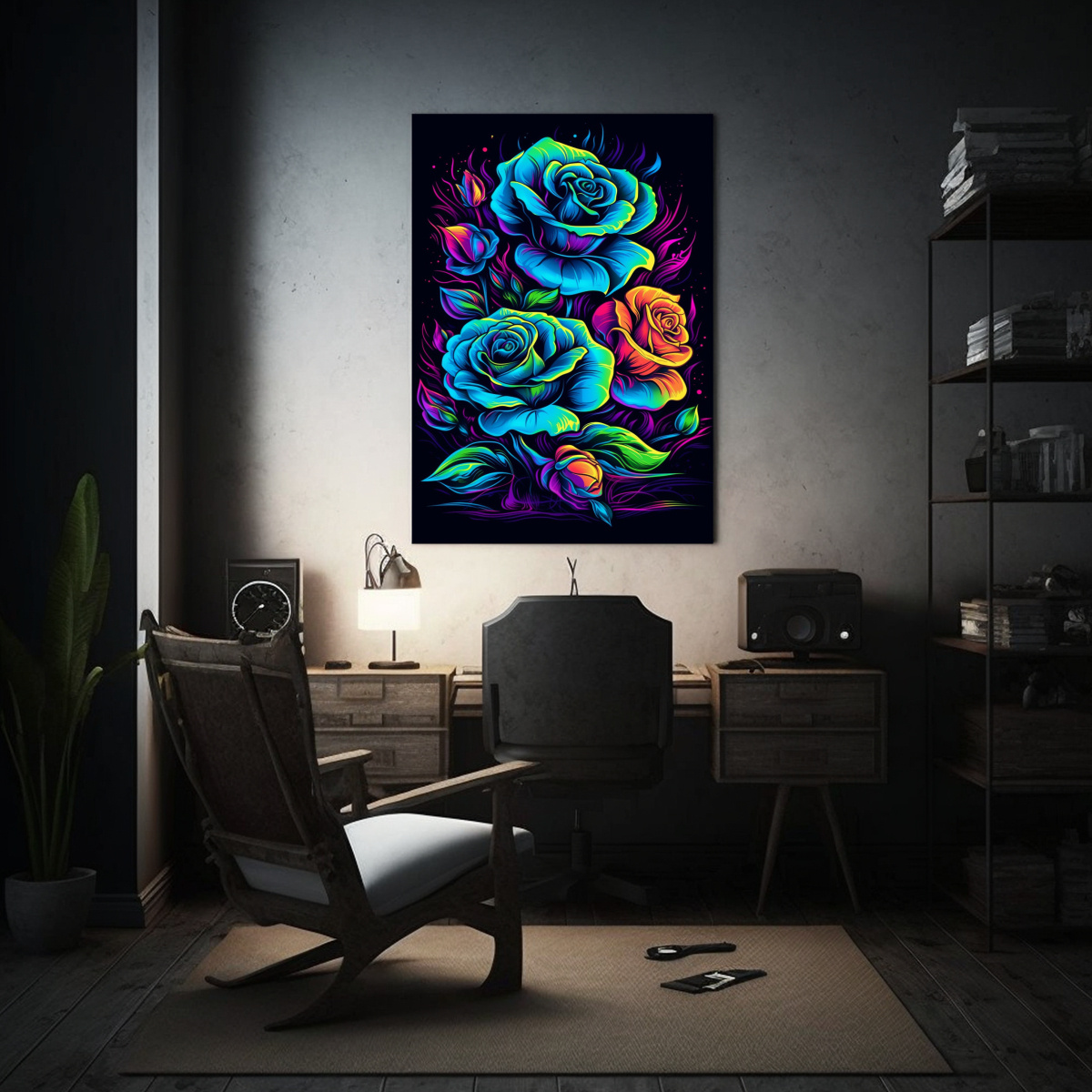 Pintura Lienzo Estilo Galería Motivo Rosas Neón Sobre Fondo Oscuro Colorido