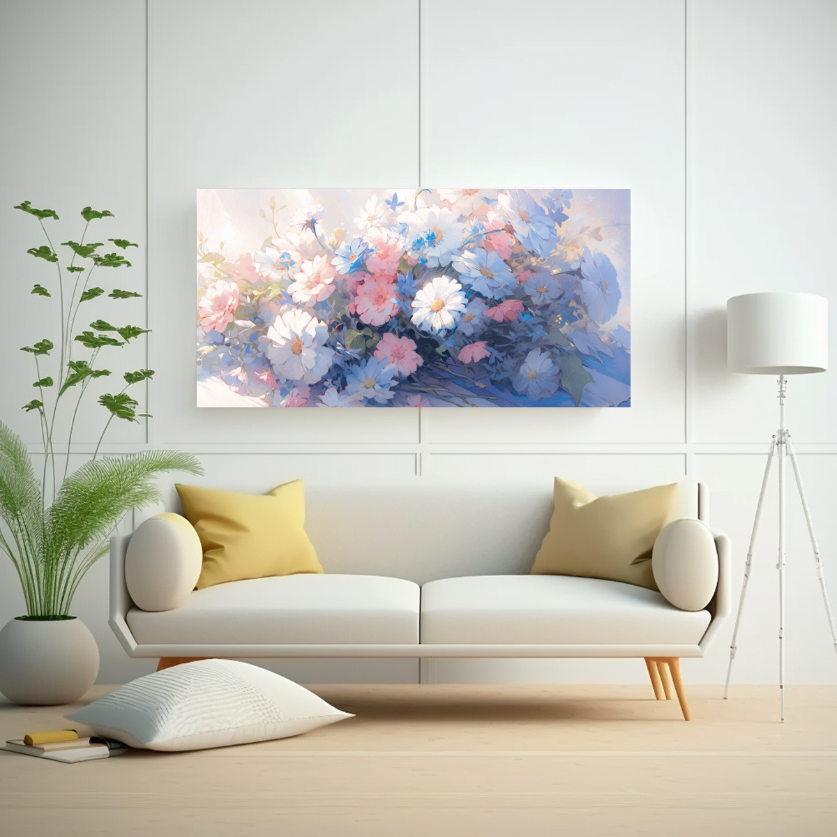 Este cuadro de flores pastel se vería perfecto en un dormitorio o sala de estar con una decoración suave y relajada Combínalo con cojines en tonos gris y lila, y agrega cortinas blancas para resaltar los colores suaves del cuadro Crea un ambiente tranquilo y armonioso en tu hogar con esta hermosa obra de arte