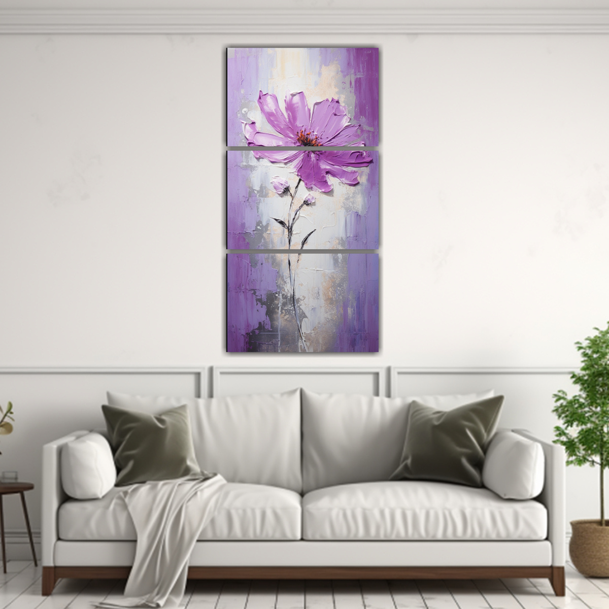 Este cuadro sería ideal para colocar en un dormitorio o sala de estar con una paleta de colores neutros, como blanco y gris Puedes combinarlo con cojines y cortinas en tonos lila y plateado para crear un ambiente relajante y sofisticado
