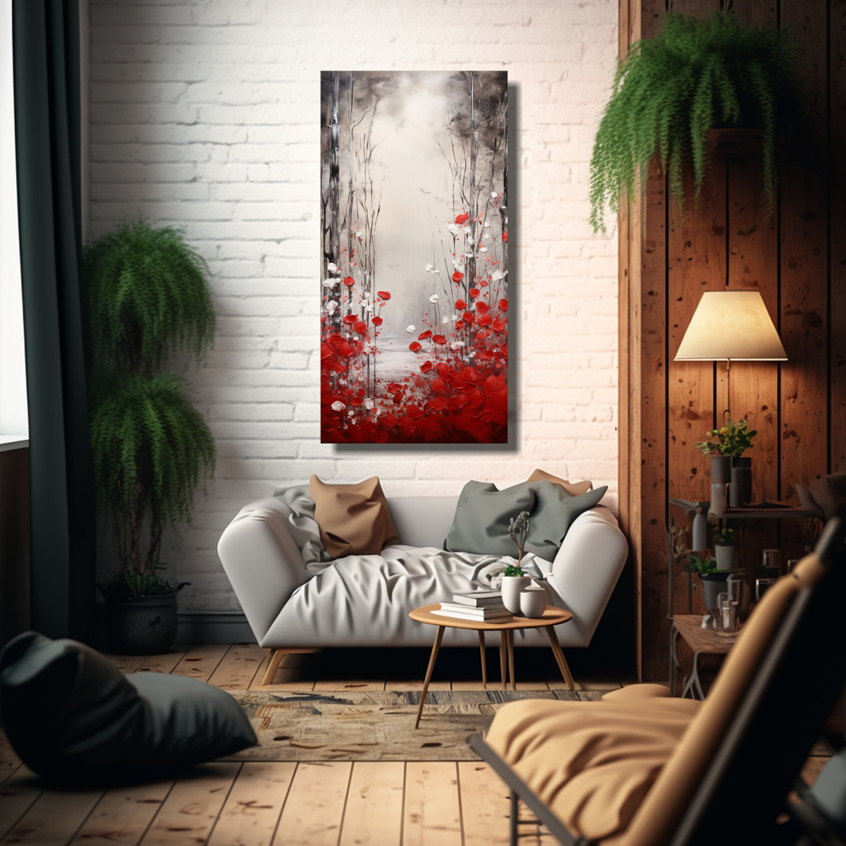 Este cuadro en tonos rojos y plateados es perfecto para decorar un salón moderno Combínalo con muebles negros y detalles en plata para crear un ambiente elegante y sofisticado