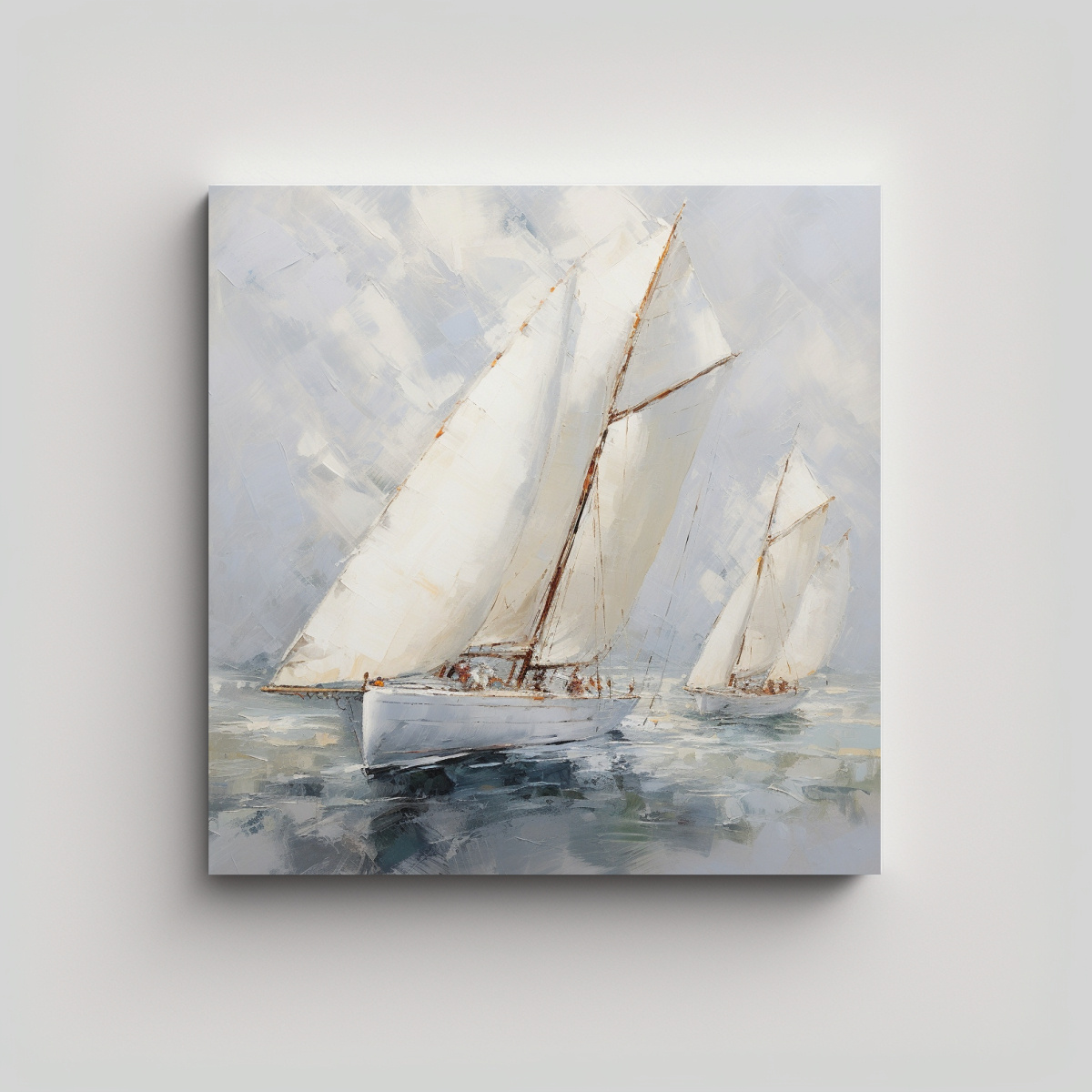 Pintura Moderna En Tela De Barcos Blancos Con Vela Llamativa En Bastidor