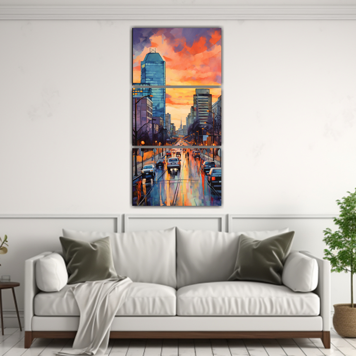 Pintura Moderna Neoexpresionista De Paisaje Urbano En Bastidor: Combinación De Tres Telas.
