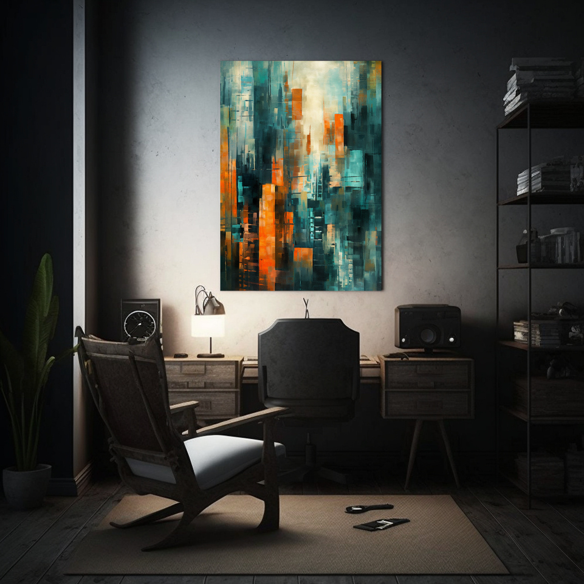 Este cuadro de Arte Urbano en tonos turquesa y naranja será el complemento perfecto para tu sala de estar Colócalo sobre un sofá gris o blanco para resaltar sus colores vibrantes y crear un ambiente moderno y sofisticado También puedes combinarlo con muebles de madera para añadir un toque cálido y acogedor ¡Deja que este cuadro sea el centro de atención en tu espacio y sorprende a tus invitados con tu estilo único!