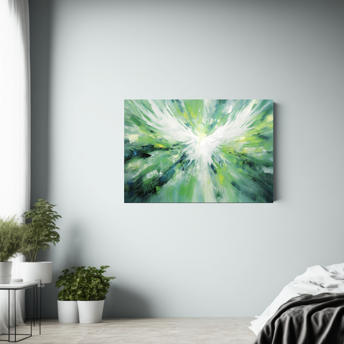 Coloca esta pintura mural de ángel en alta resolución en tu sala de estar sobre un sofá claro para resaltar los tonos de la obra Combínala con cojines en tonos neutros y una alfombra plateada para crear un ambiente sofisticado y sereno