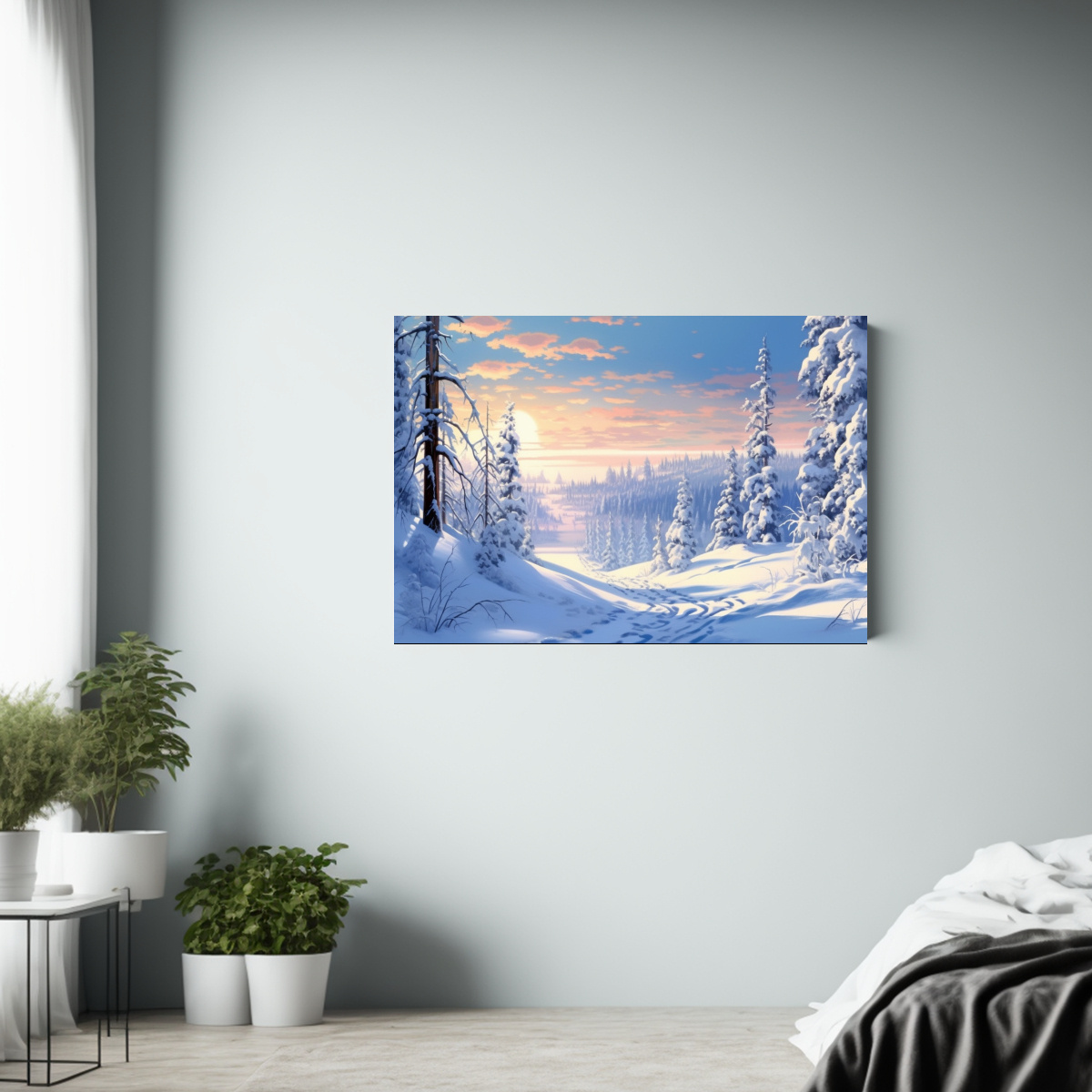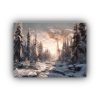 Para resaltar la belleza de este cuadro, colócalo sobre un sofá beige con cojines en tonos violeta y lila Añade una lámpara plateada para iluminar la escena nevada y crear un ambiente cálido y acogedor en tu sala de estar