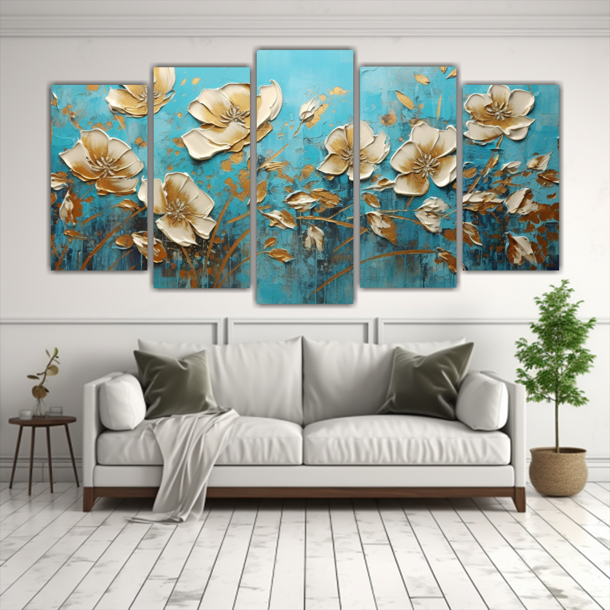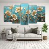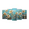 Pintura Mural En Tonos Turquesa Y Dorado En 5 Telas En Bastidor De Flores En Tonos Turquesa Y Dorado