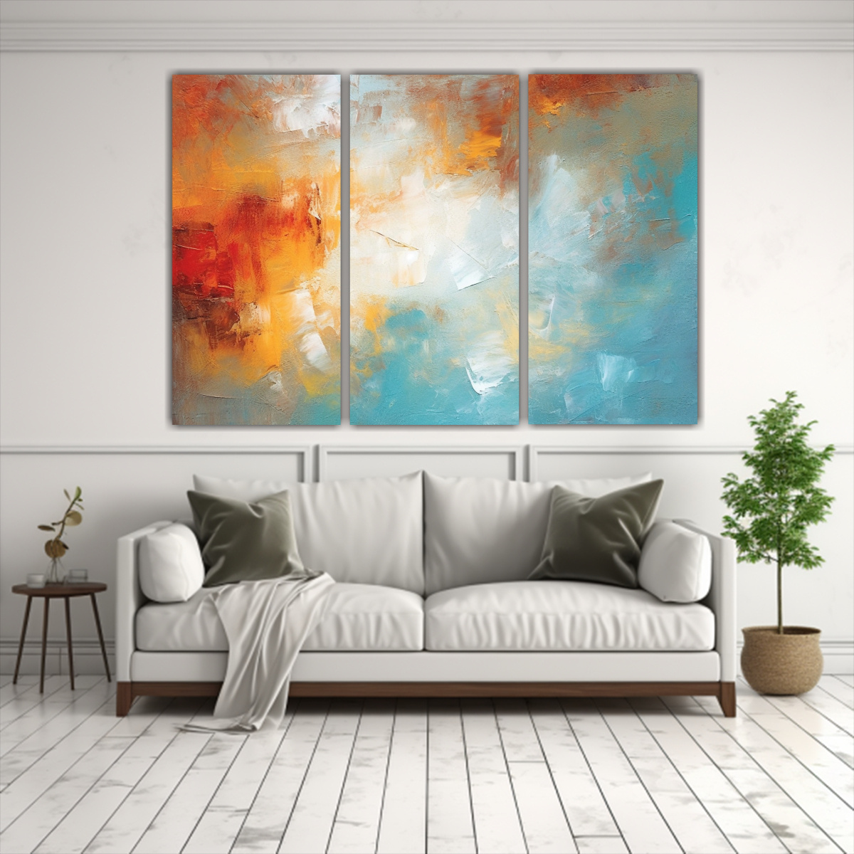 Este cuadro se vería espectacular en un salón amplio y luminoso, sobre un sofá de color neutro para resaltar sus tonos vibrantes Combínalo con cojines en tonos turquesa y plateado para crear una atmósfera sofisticada y moderna en tu hogar
