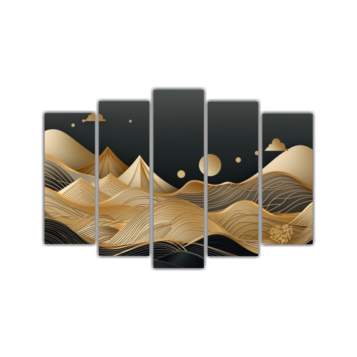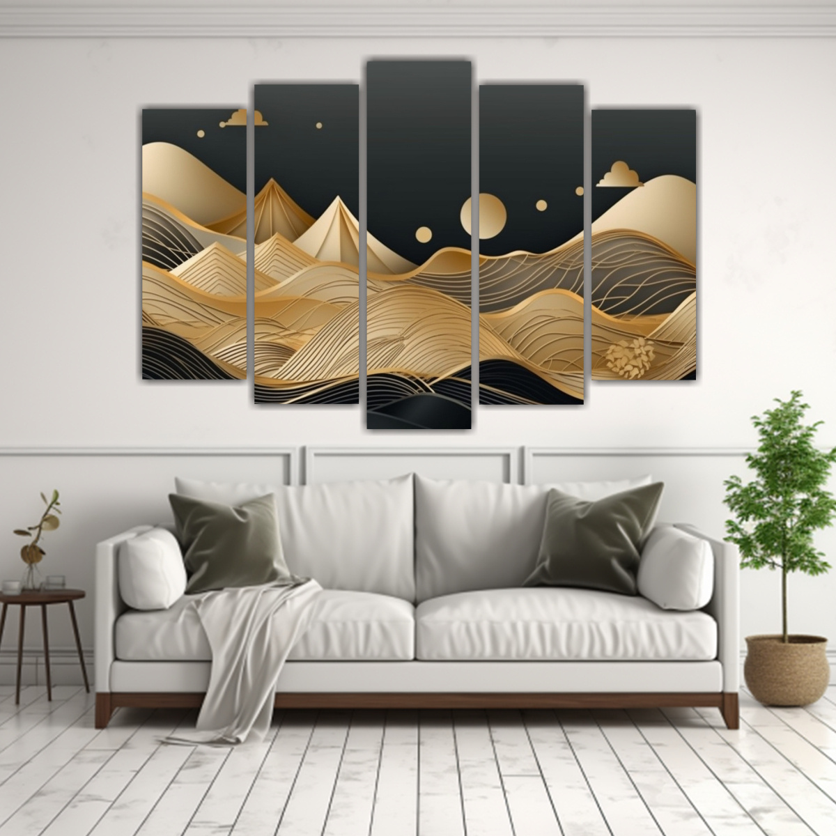 Este cuadro paisajístico moderno con montañas doradas en lienzo sería ideal para decorar el salón principal de tu casa Colócalo sobre un sofá de color neutro para que resalte y cree un ambiente elegante y sofisticado