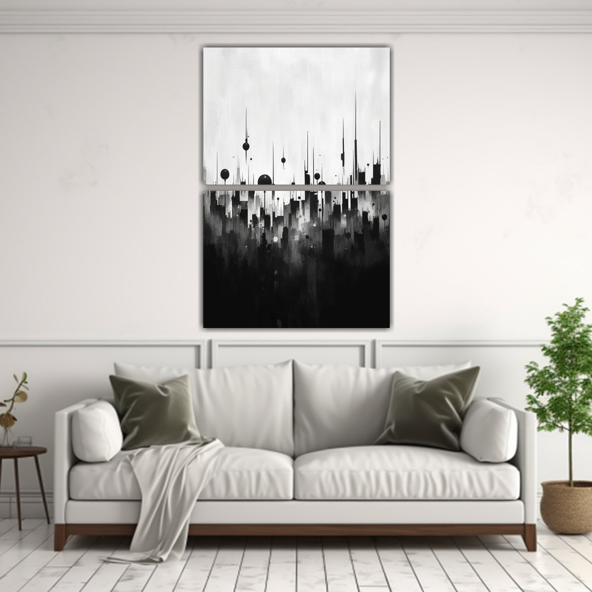 Pintura Panorámica Minimalista Y Surrealista De La Ciudad Con Diptico De Abstracción Y Naturaleza Viva