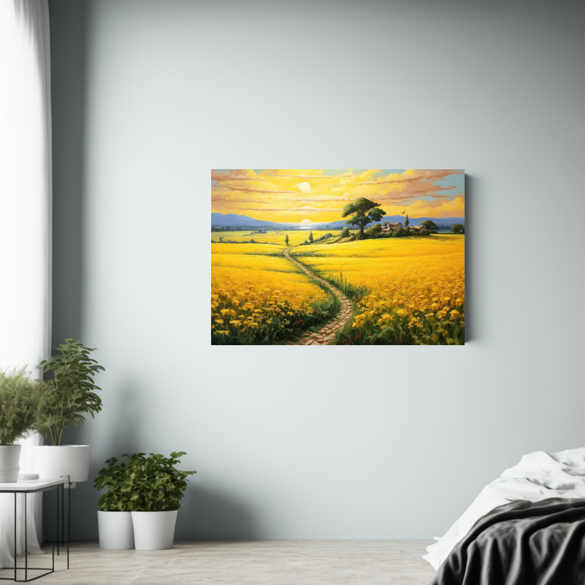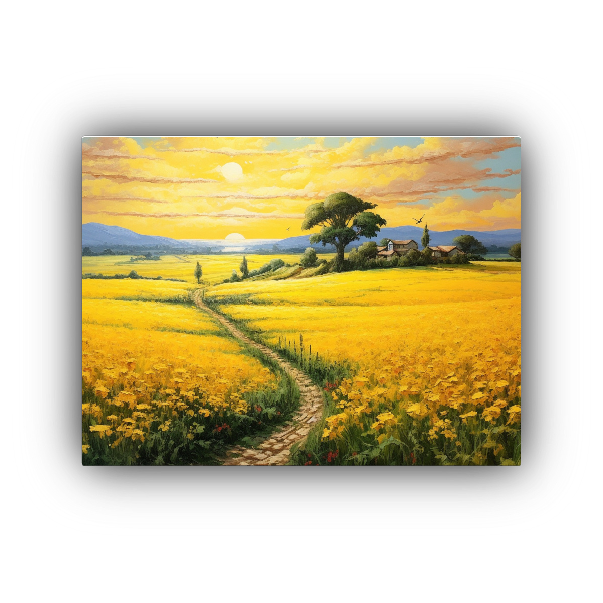 Este cuadro de paisaje rural encajaría perfectamente en un salón estilo vintage junto a muebles de madera y colores cálidos También sería ideal para resaltar una pared blanca en un dormitorio acogedor ¡Atrévete a darle vida a tus ambientes con este diseño exclusivo!