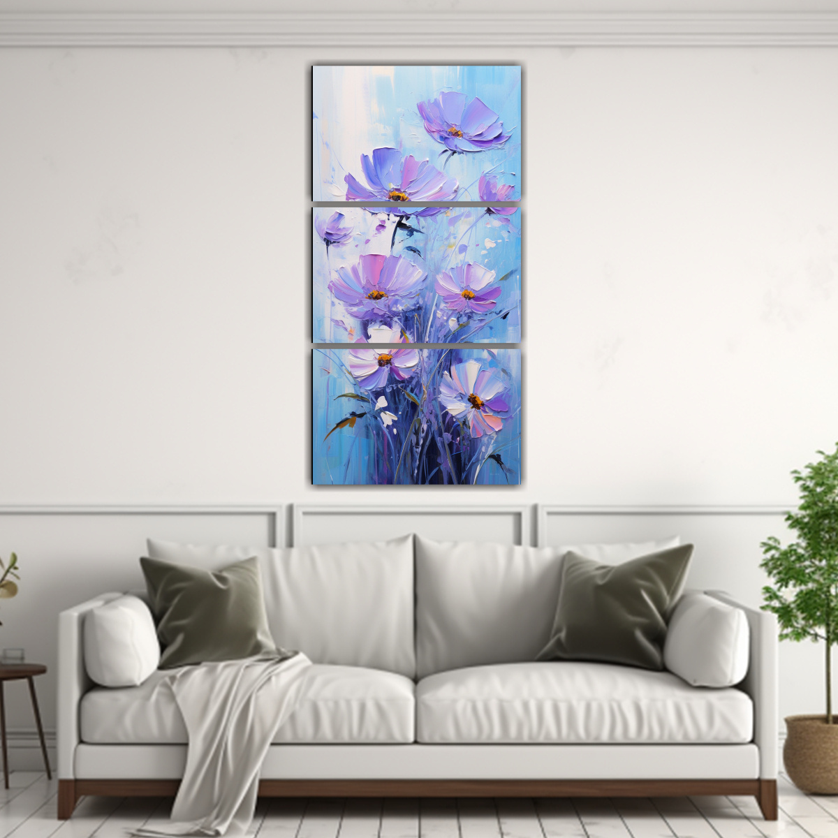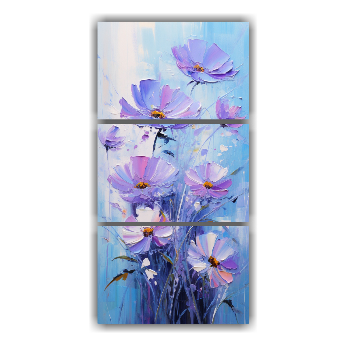 Para realzar la belleza de este cuadro de flores morado y azul, te recomendamos colocarlo en un espacio con tonos neutros como blancos, grises o beige Perfecto para salas de estar, dormitorios o incluso en un pasillo para dar un toque de color y sofisticación