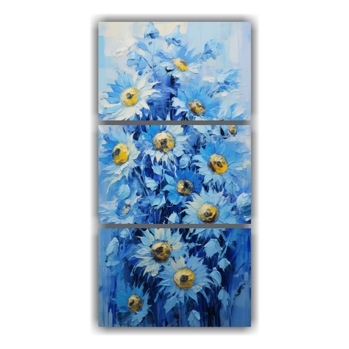 Añade un toque de elegancia y frescura a tus espacios con esta pintura sobre lienzo de girasoles azules DecoCuadros ofrece los precios más baratos del mercado y entregas rápidas y gratuitas en Santiago, ¡no te lo pierdas!
