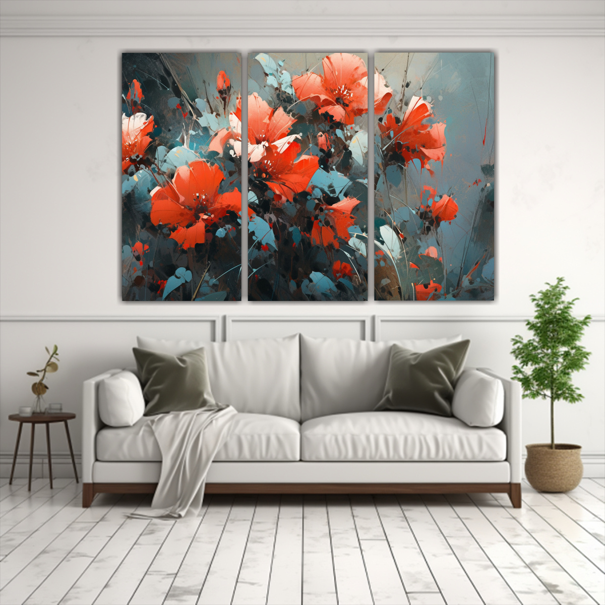 Este hermoso Set de 3 Lienzos en colores Rojo y Turquesa con flores es ideal para decorar tu sala de estar Colócalo sobre un sofá gris para resaltar su elegancia y combinará a la perfección