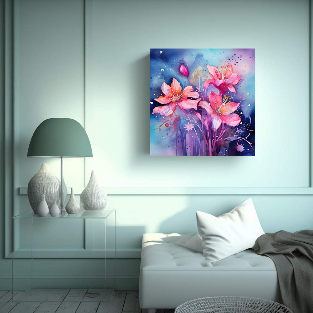 Decora tus espacios con nuestros cuadros decorativos estilo Watercolours con atmósfera neonoir Colores como azul marino grisaceo, turquesa, rosado claro, morado, lila, coral, plateado y gris se combinan en esta pintura sobre lienzo de alta calidad En DecoCuadros encontrarás los diseños exclusivos y de mejor calidad del mercado a los precios más económicos Ofrecemos entregas rápidas y gratuitas en Santiago y envíos express a regiones