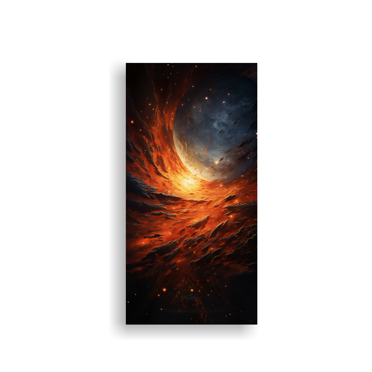 Coloca el cuadro de tela Impacto cósmico de un meteorito en tu sala de estar para crear un ambiente moderno y sofisticado Combínalo con muebles en tonos neutros como blanco y gris, y añade algunos cojines en colores cálidos como rojo y amarillo para resaltar los tonos carmesí y dorado del cuadro ¡Impresiona a tus invitados con esta pieza única de arte!