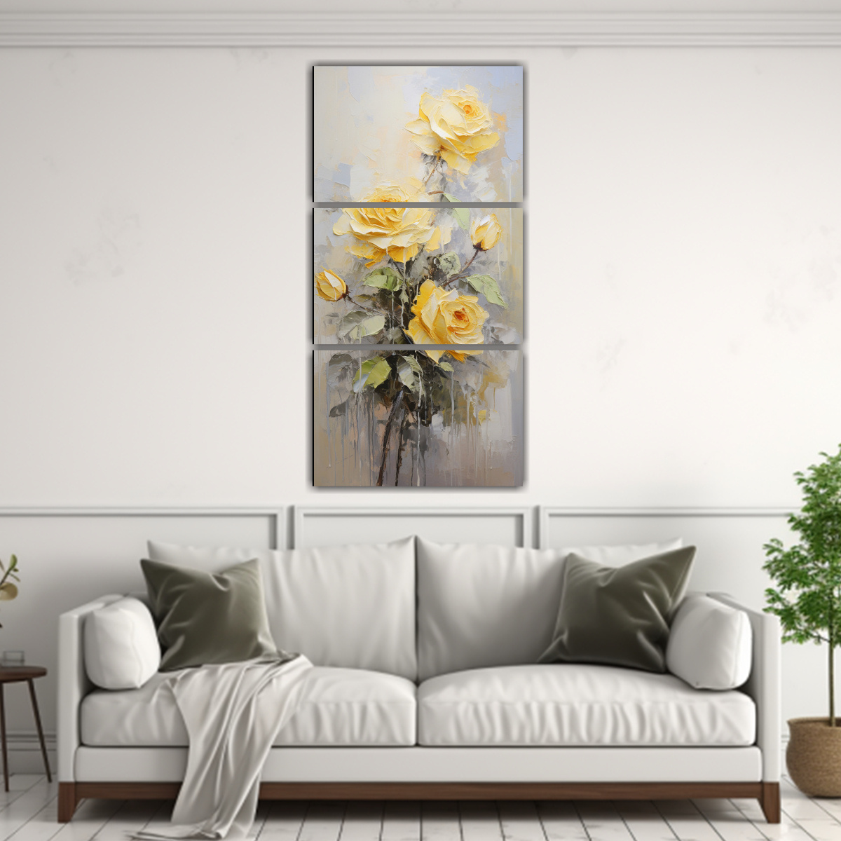 Pintura Tríptica De Rosas Amarillas En Lienzo, Estilo Decorativo