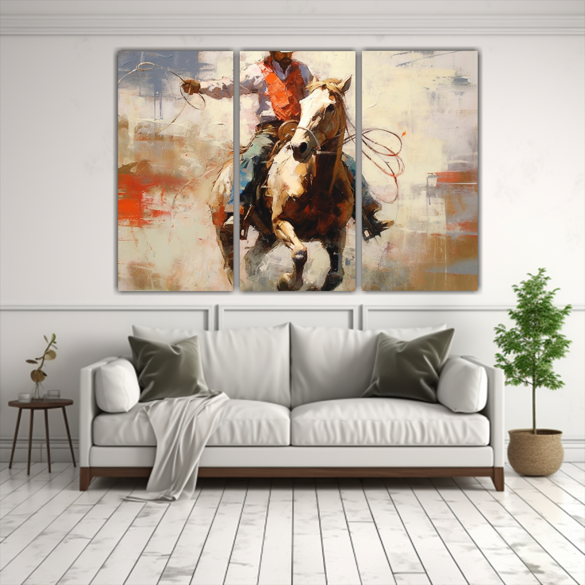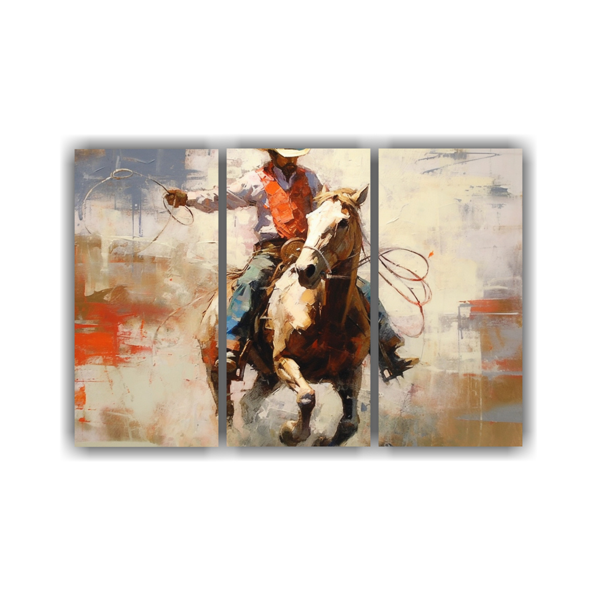 Este cuadro tríptico de vaquero con lazo se vería espectacular en la sala de estar sobre un sofá de color beige, creando un contraste elegante y moderno Combínalo con cojines en tonos gris y plateado para resaltar su estilo neoexpressionista victoriano