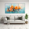 Este cuadro tríptico de flores en colores turquesa y naranja se verá espectacular en una sala de estar moderna Colócalo sobre un sofá gris claro para resaltar sus tonos vibrantes y combínalo con cojines en los mismos colores ¡Aportará una atmósfera fresca y alegre a tu espacio!