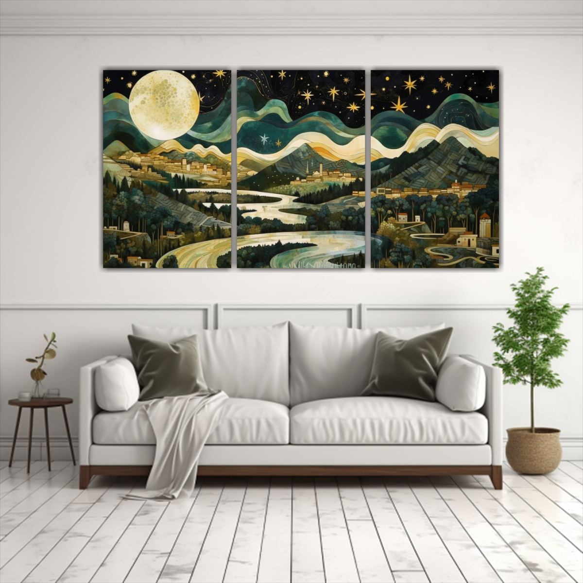 DecoCuadros te ofrece este tríptico de abstracción calidez con una hermosa luna cerca de las montañas, en tonos plateado, azul marino grisaceo, gris, mostaza y chocolate Impreso en tela de alta calidad con bastidor de madera Renueva tus espacios con estilo y sofisticación