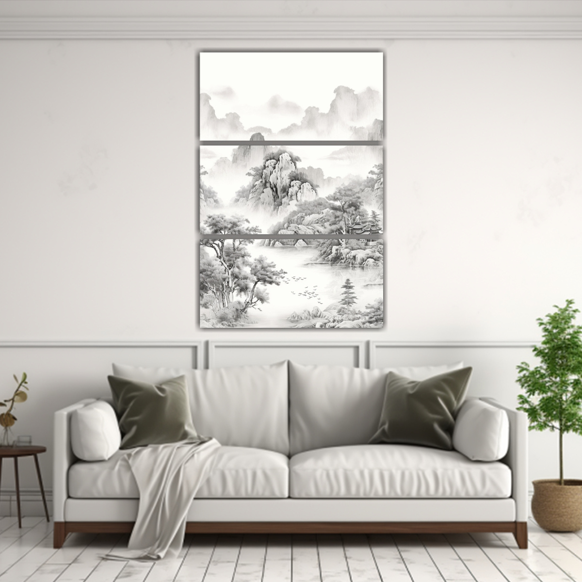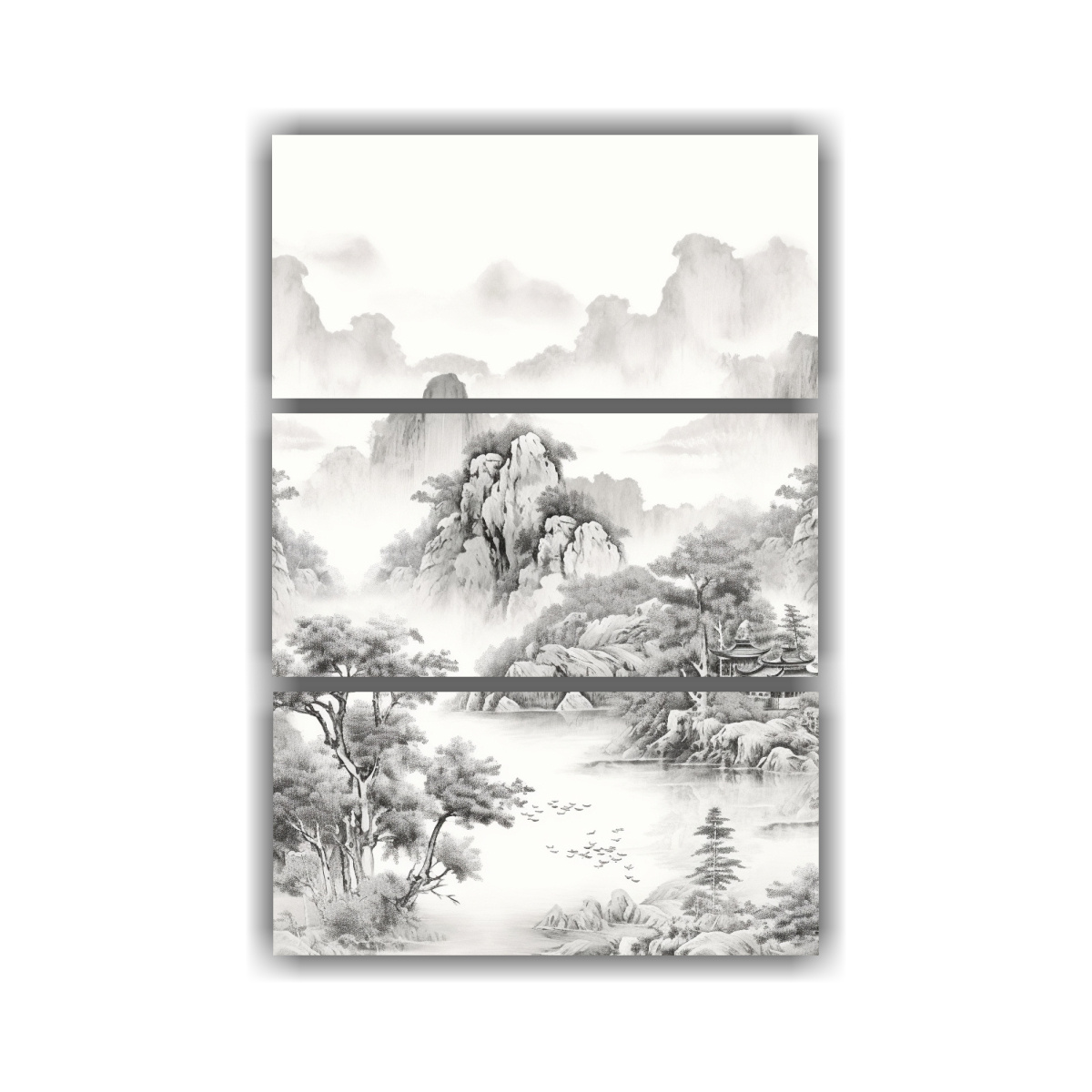 Este cuadro tríptico de movimiento estilo chino con río en tonos beige, azul marino grisaceo, gris y plateado sería ideal para colocar sobre la cabecera de tu cama en el dormitorio Sus colores suaves y relajantes aportarán serenidad y paz al ambiente, creando un espacio perfecto para descansar y relajarse