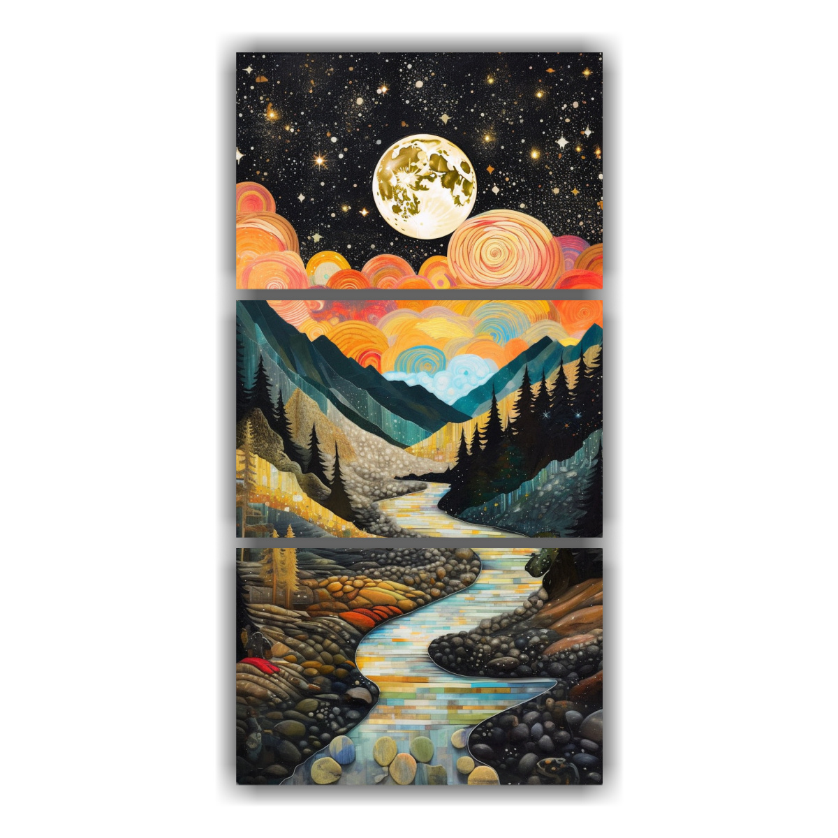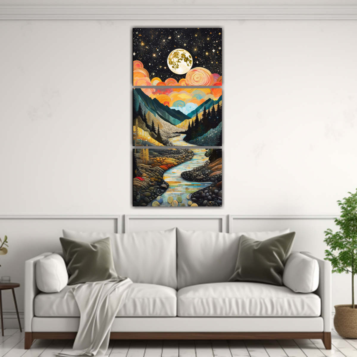 DecoCuadros presenta este tríptico vertical con una luna radiante sobre montañas, en colores vibrantes Aporta originalidad a tu decoración con esta pieza única y exclusiva ¡Hazte con él ahora!