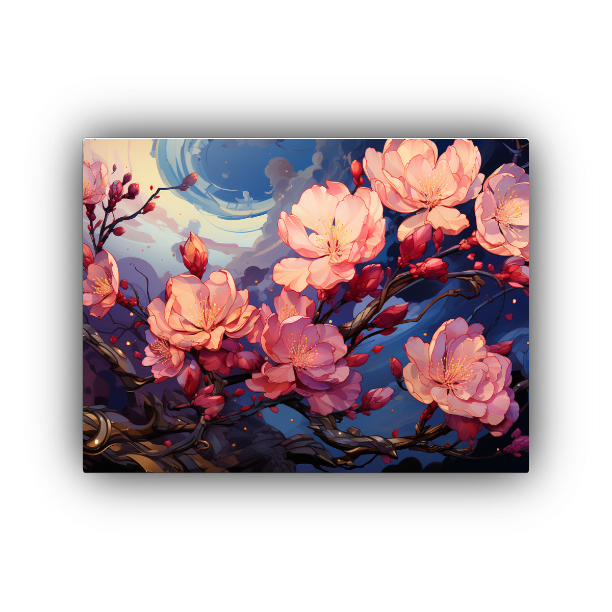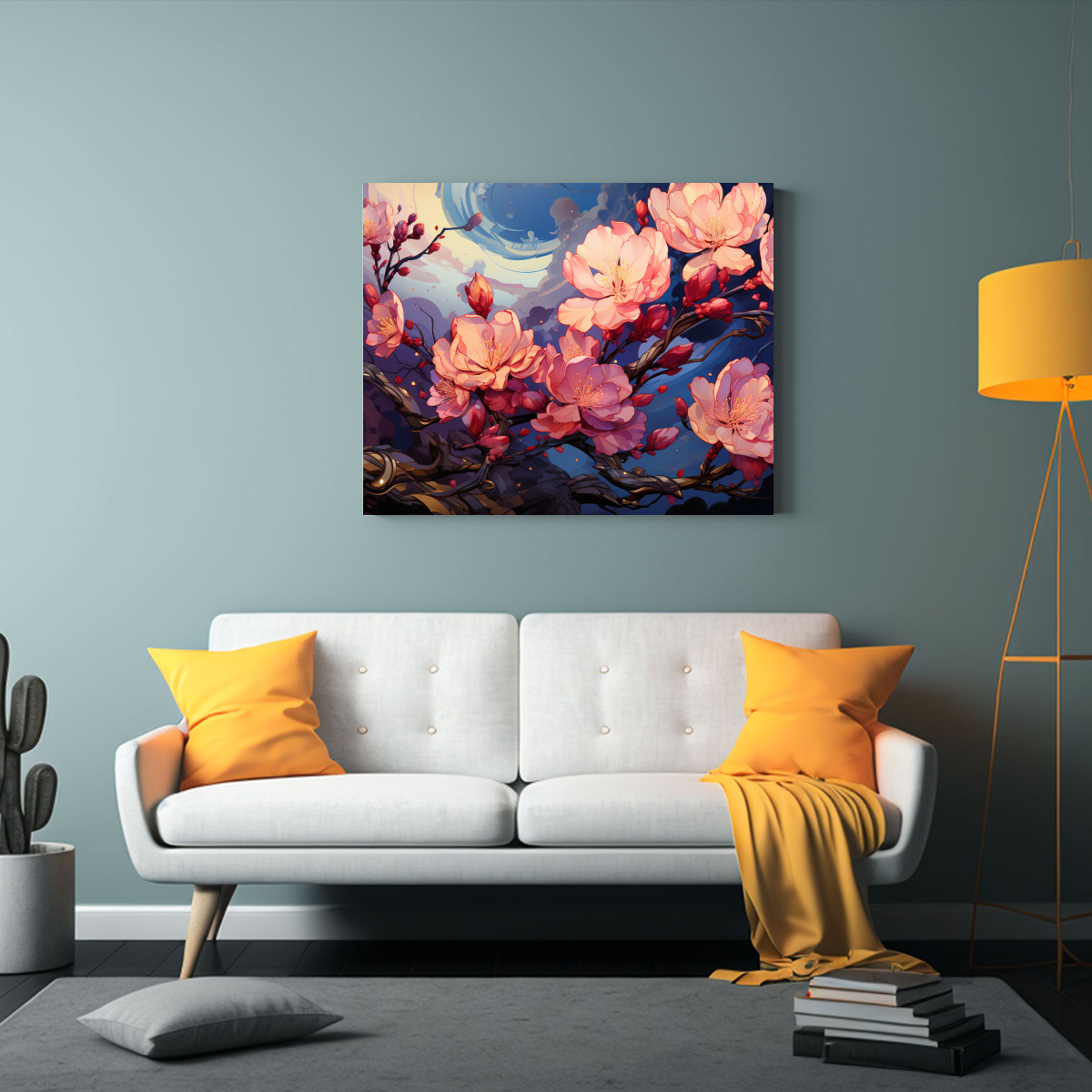 Pintura Vanguardia Equilibrio Árbol Durazno En Púrpura Y Dorado, Atmósfera Neonoir
