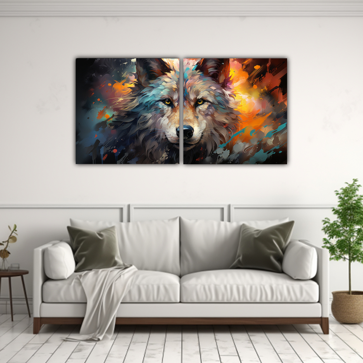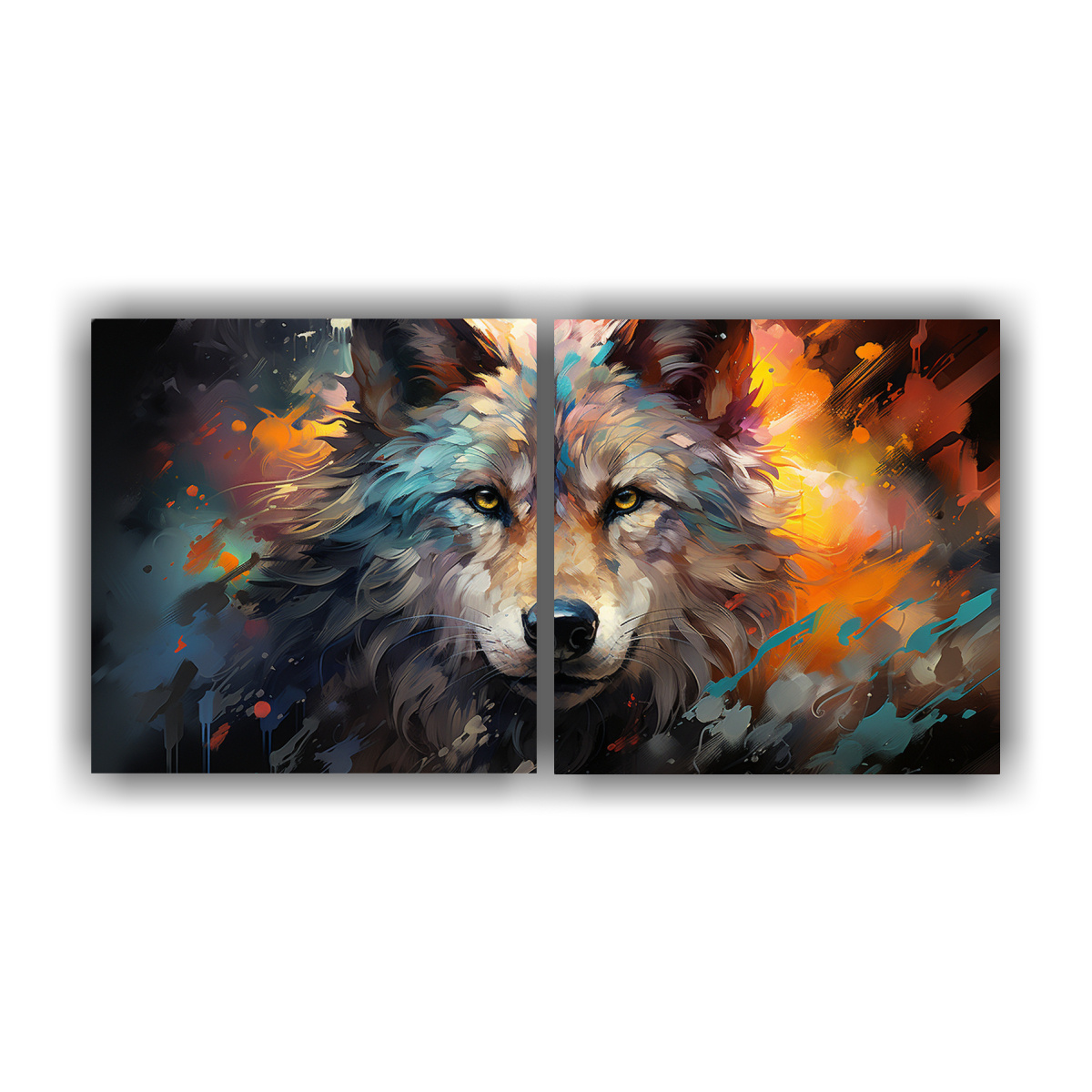 Este cuadro de lobos coloridos en estilo Pop Art sería perfecto para decorar tu sala de estar sobre un sofá gris claro, creando un contraste elegante y llamativo Complementa con cojines en tonos Coral, Menta y Turquesa para lograr un ambiente moderno y sofisticado ¡Atrévete a ser único en tu decoración!