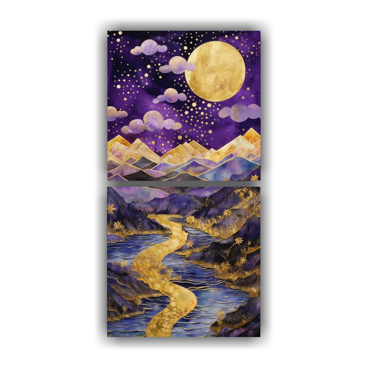 DecoCuadros tiene disponible el cuadro Pintura Vertical con Luna y Montañas Estilo Profundo Impreso en tela de alta calidad con bastidores de madera Los colores Plateado, Azul Marino grisaceo, Gris, Dorado, Lila y Mostaza resaltan la belleza de la pintura Nuestros cuadros son ideales para decorar cualquier espacio y brindar un toque único Ofrecemos la mejor calidad del mercado a precios económicos Realizamos entregas rápidas y gratuitas en Santiago, con envíos express a regiones