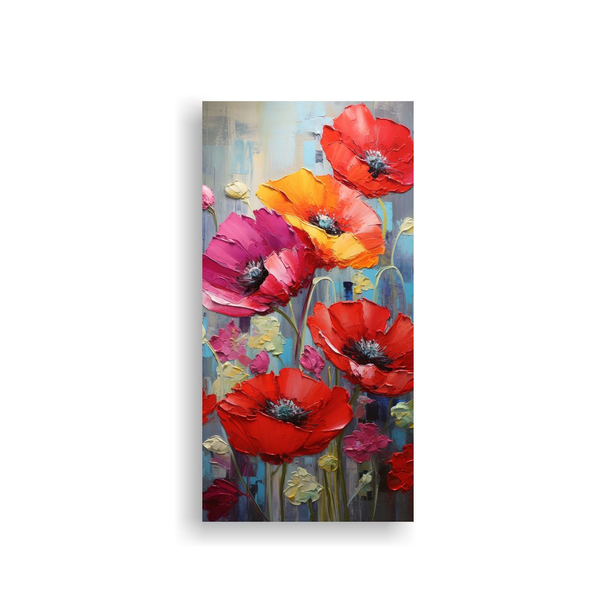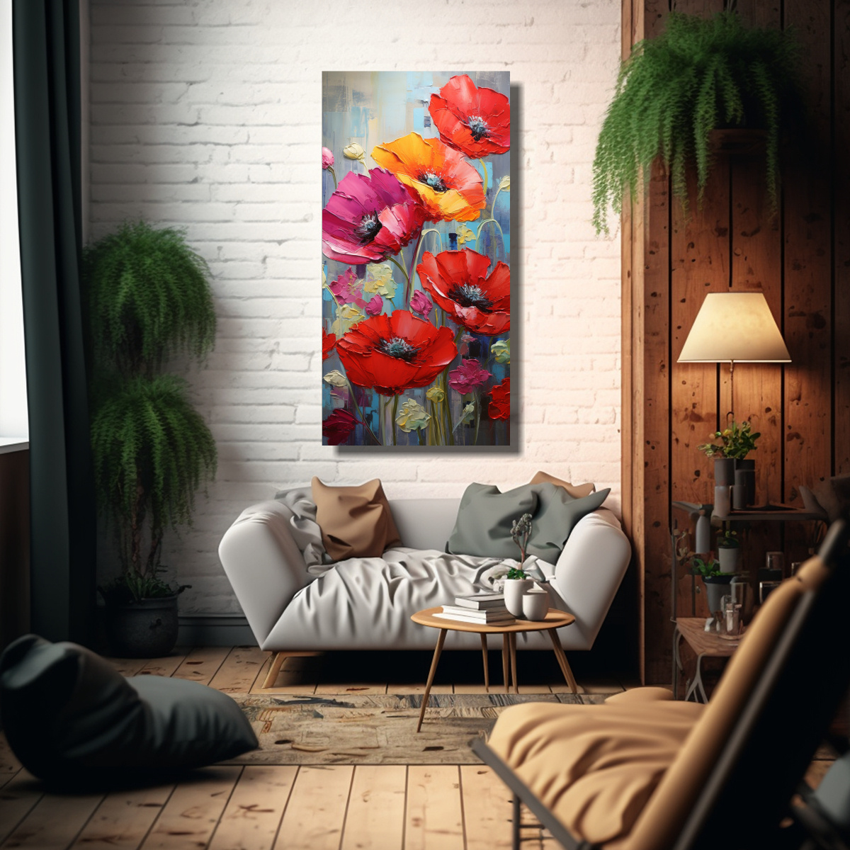 Pintura Vertical En Lienzo De Amapolas Vibrantes Para Decoración En Exposición De Arte