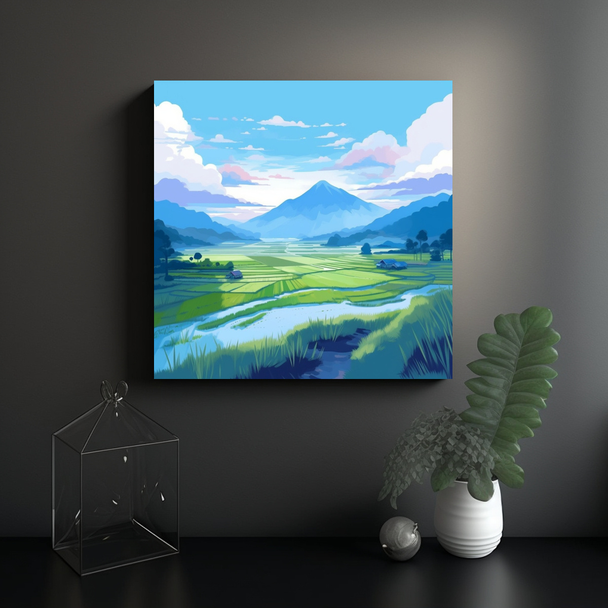 Agrega un toque único a tu hogar con esta pintura vintage que representa la tranquilidad de los campos de arroz y la imponencia de las montañas Envío gratis en Santiago y envíos express a regiones ¡Decora con elegancia y ahorra con DecoCuadros!