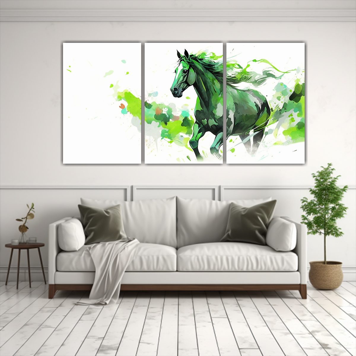 DecoCuadros presenta un tríptico vintage con la Textura A Quarter Horse in Watercolours AND Green Colors creado en tonos Gris, Azul Marino grisaceo, Menta, Beige y Plateado Calidad superior y precios accesibles en cuadros decorativos