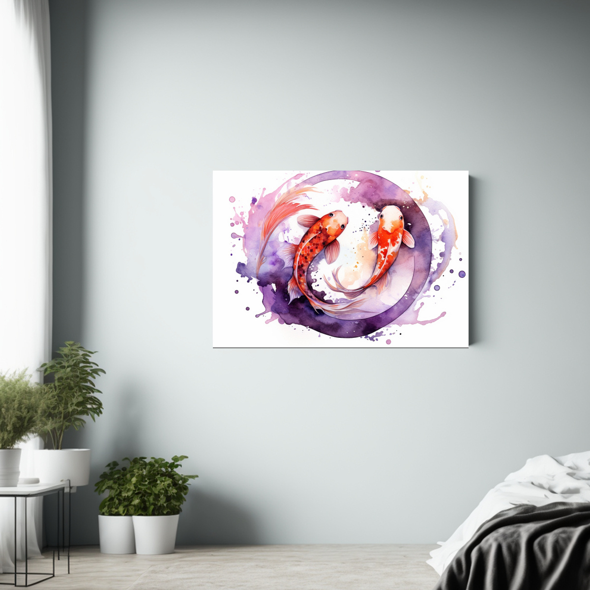 Añade un toque de elegancia con este cuadro acuarela de peces koi nadando en círculo ying, ideal para salas o espacios zen Envíos gratis en Santiago y entrega express en regiones ¡Renueva tu decoración con estilo!