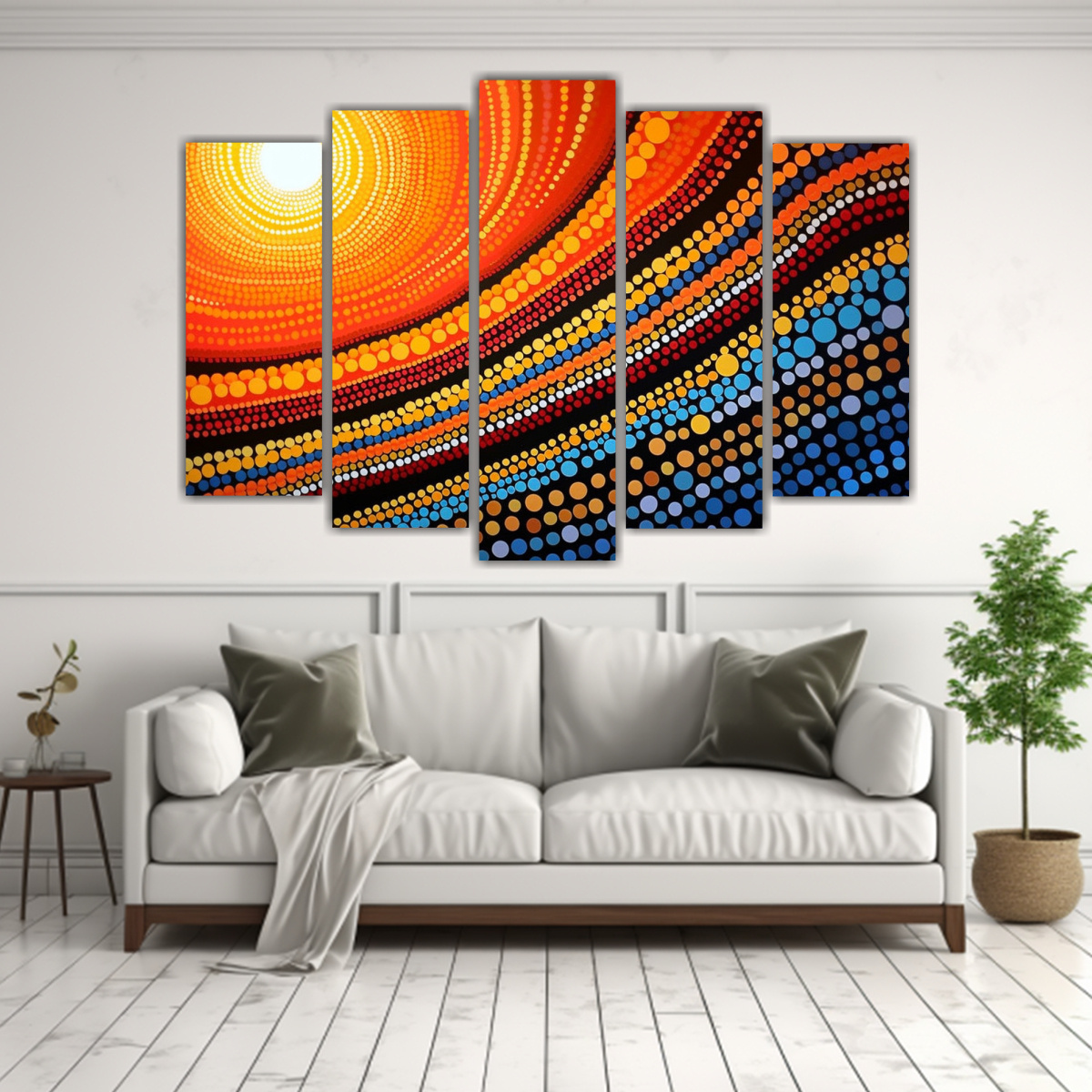 Este cuadro temático aborigen al atardecer sería perfecto para colocar en el salón principal de tu casa, sobre un sofá de color neutro, para resaltar y crear un ambiente acogedor Combínalo con cojines en tonos cálidos y una iluminación suave para realzar su belleza