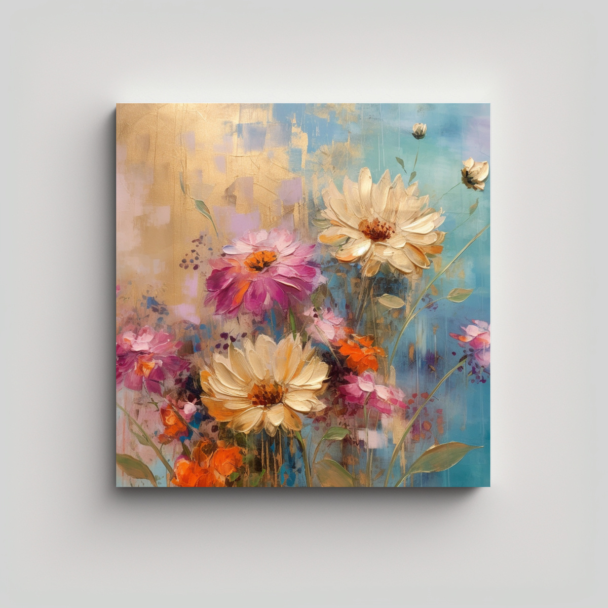 Este cuadro abstracto de flores en equilibrio se vería espectacular en la sala de estar, combinando a la perfección con muebles de colores neutros para resaltar su vibrante paleta Colócalo en un lugar destacado para aportar frescura y elegancia a tu espacio