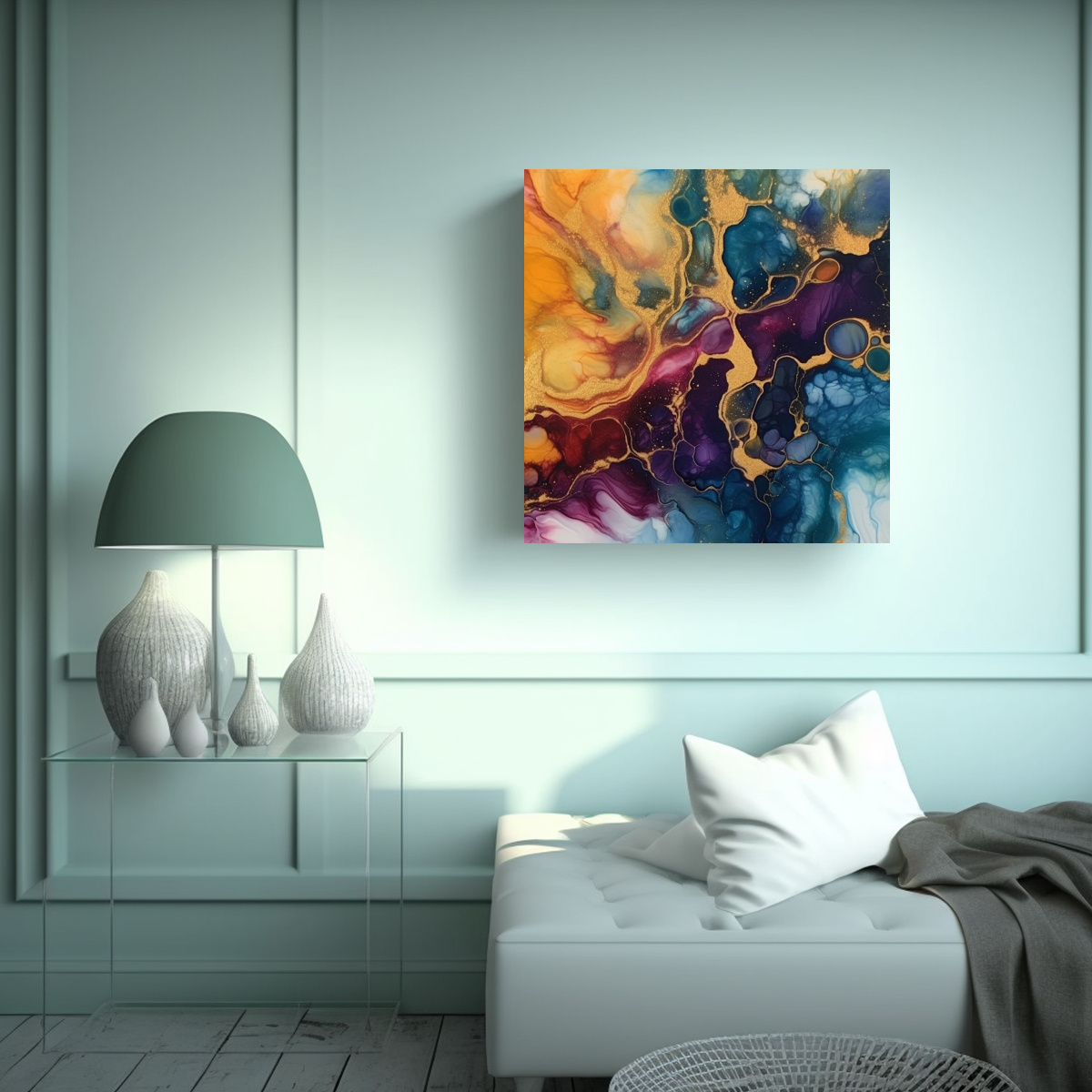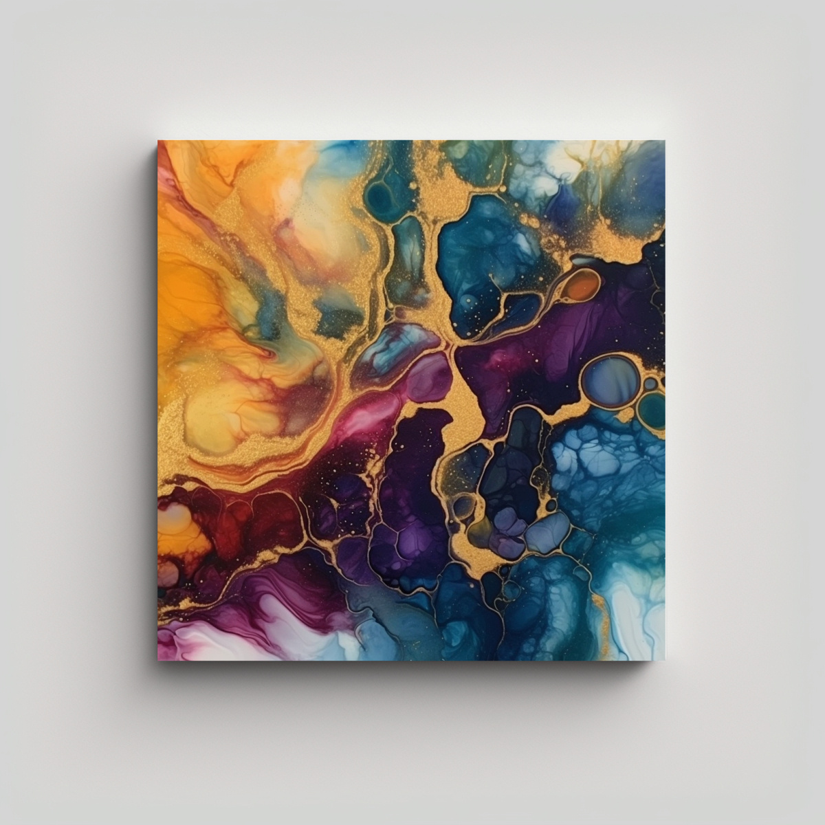 Nuestro cuadro ‘Pinturas abstractas con alcohol ink en tonos joya dorados’ sería perfecto para resaltar una pared en la sala de estar o en el dormitorio principal Su combinación de colores coral, azul marino grisáceo, gris, plateado y carmesí le da un toque de sofisticación y profundidad a cualquier espacio