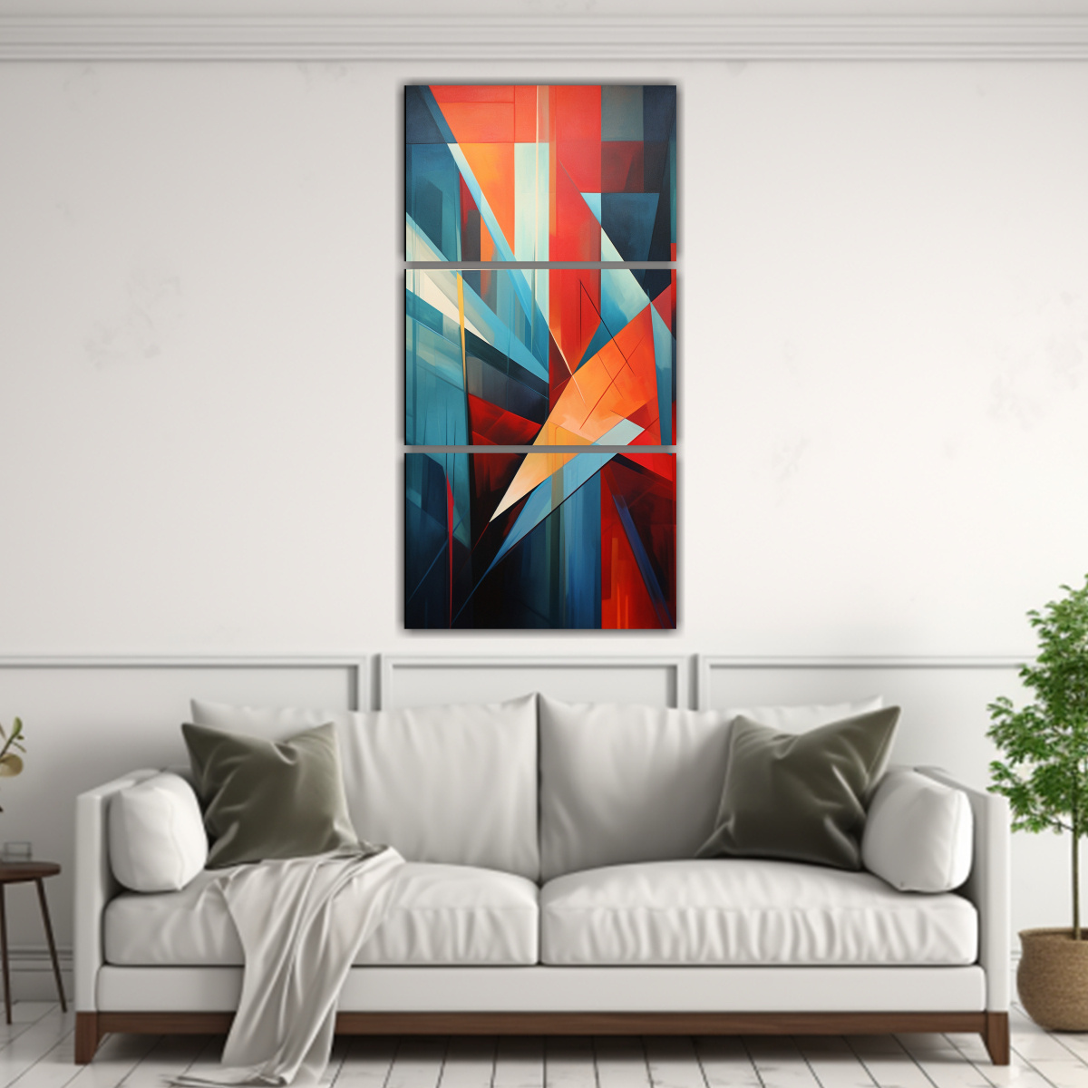 Este set de pinturas abstractas con formas geométricas en los colores Coral, Turquesa y Menta es perfecto para decorar una sala de estar moderna Puedes colocar el cuadro más grande en la pared central y los otros dos cuadros a ambos lados, creando un efecto simétrico Combínalos con muebles en tonos neutros y accesorios en colores que resalten para lograr un ambiente vibrante y sofisticado