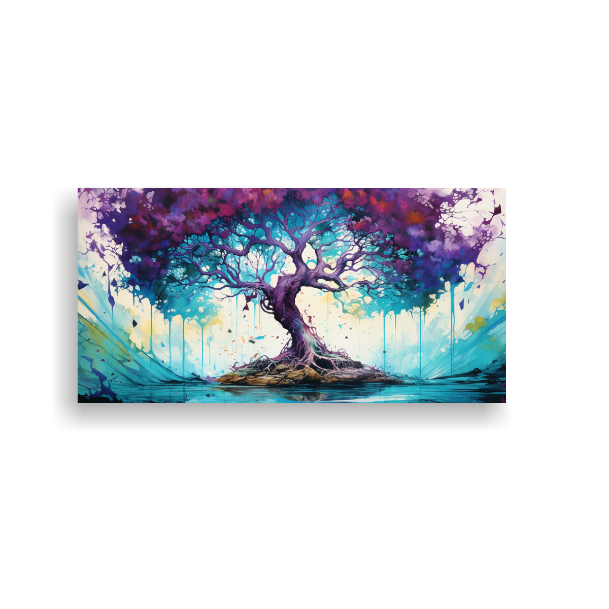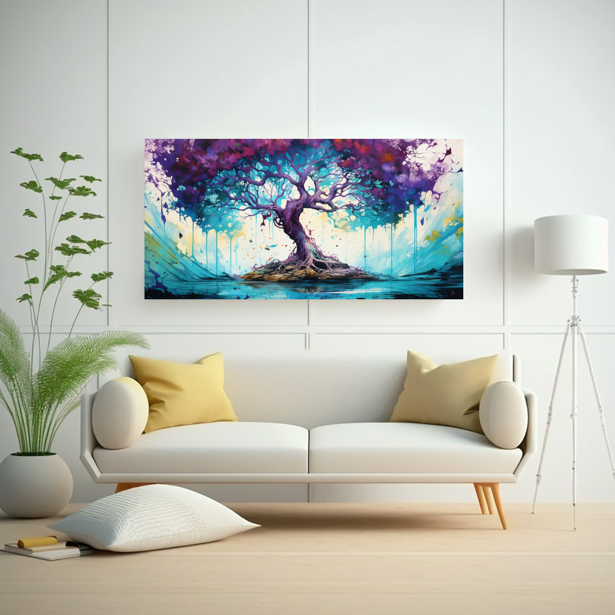 Este cuadro abstracto Banyan Tree en morado y turquesa es ideal para decorar tu sala de estar Combínalo con muebles en tonos neutros como beige o gris para resaltar su belleza y crear un ambiente moderno y elegante