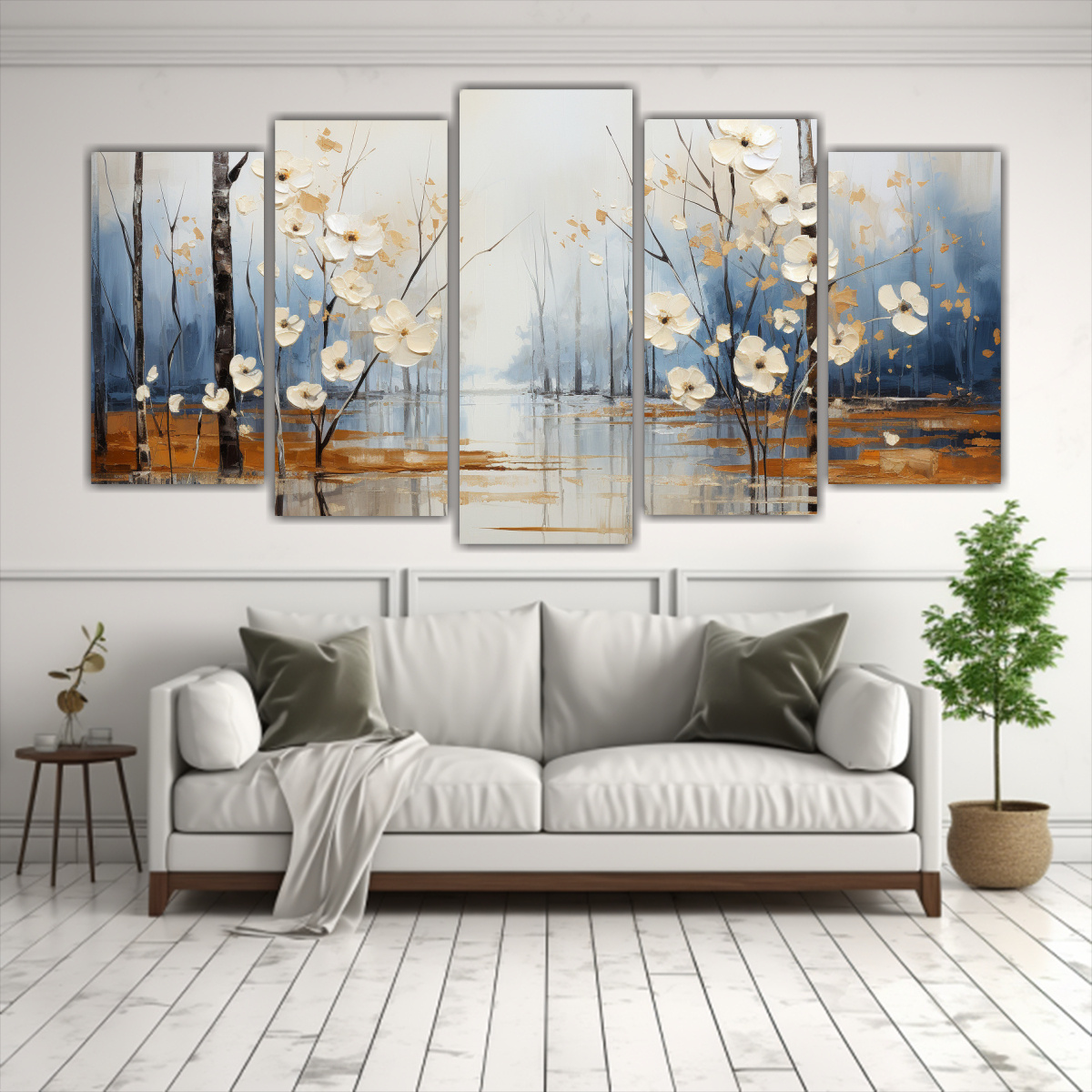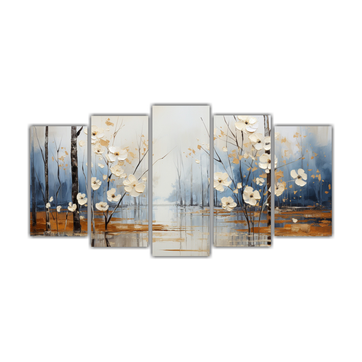 Pinturas Abstractas De árboles En Plata Y Blanco En Cinco Bastidores Modernos.