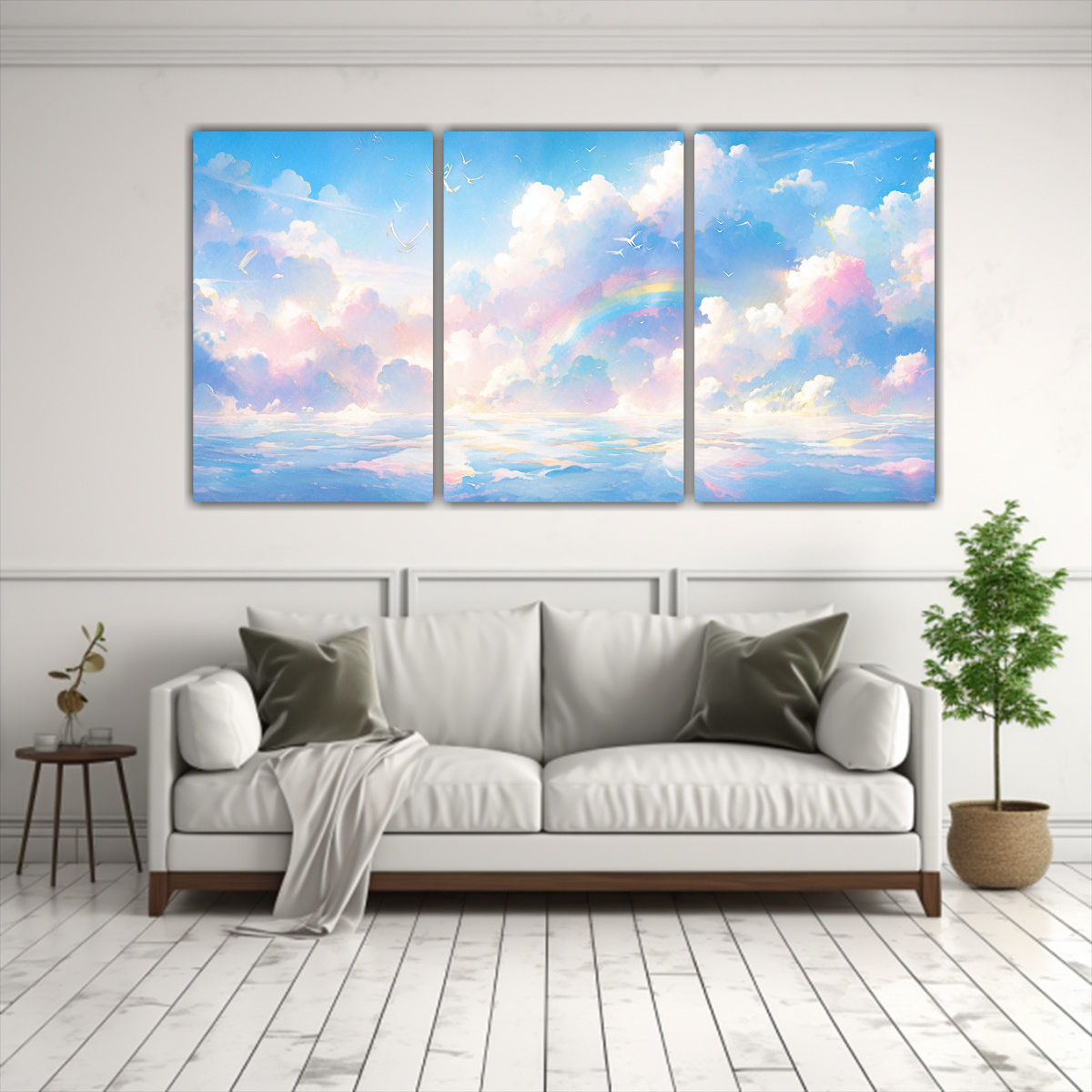 Este cuadro de armonía entre cielo y mar con colores arcoíris y blancos es ideal para la sala de estar, el dormitorio o incluso la oficina Colócalo en un espacio amplio y luminoso, combinándolo con muebles en tonos neutros para resaltar su belleza y crear un ambiente sereno y relajante ¡Dale un toque de frescura y elegancia a tus paredes con esta obra de arte!