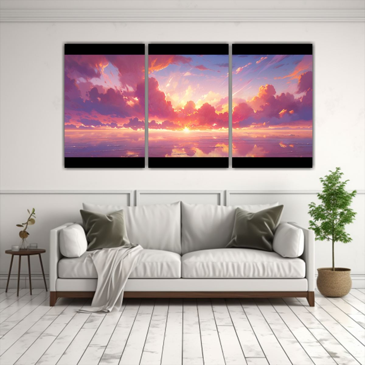 Coloca este espectacular set de cuadros decorativos en la sala de estar sobre un sofá gris para crear un ambiente sofisticado y acogedor Compleméntalo con cojines en tonos morados y blancos para resaltar la belleza de los colores del atardecer y amanecer