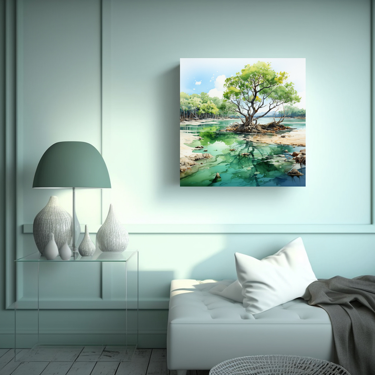 Descubre nuestras pinturas abstractas de colores actuales de un árbol de mangle en acuarelas Nuestra tienda online DecoCuadros ofrece cuadros decorativos impresos en tela de alta calidad con bastidores de madera Los colores Azul Marino grisáceo, Beige, Gris, Plateado y Menta le darán un toque único a tu hogar Además, contamos con los diseños exclusivos más atractivos del mercado