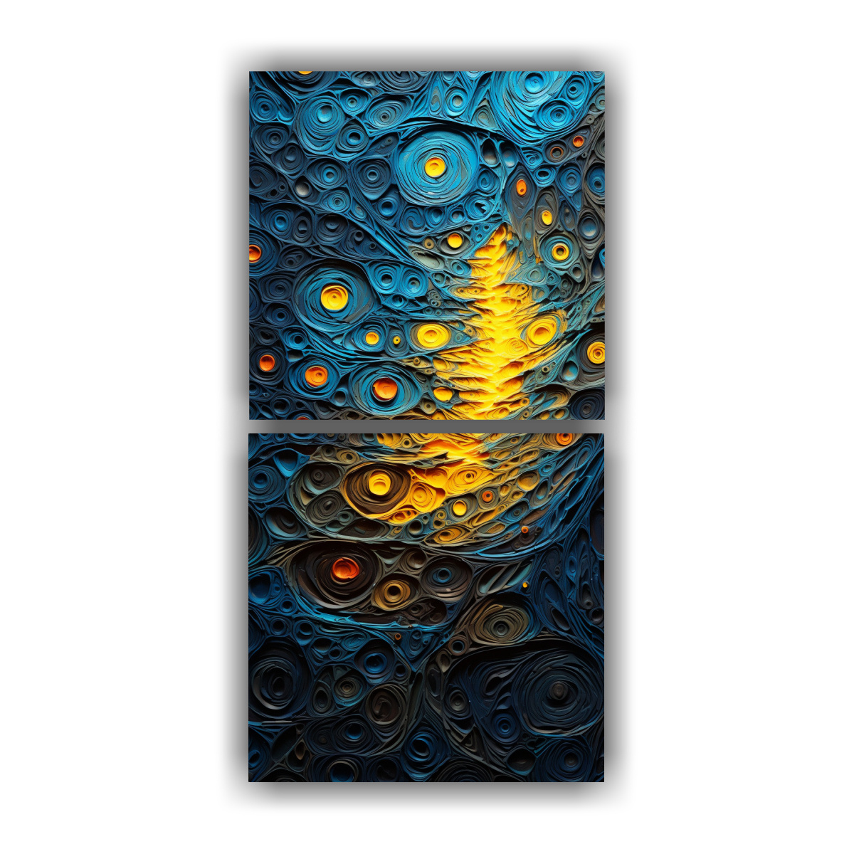 Decora tu hogar con nuestro cuadro abstracto de dos artes concepto simétrico deep dream con contrastes en colores mostaza, turquesa, negro, dorado, verde azulado, azul marino grisaceo, chocolate y plateado Impreso en tela de alta calidad con bastidor de madera, este cuadro exclusivo de DecoCuadros será el centro de atención en cualquier espacio